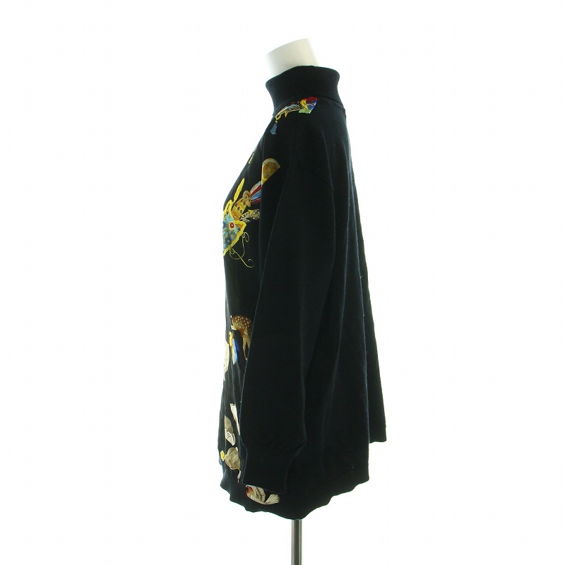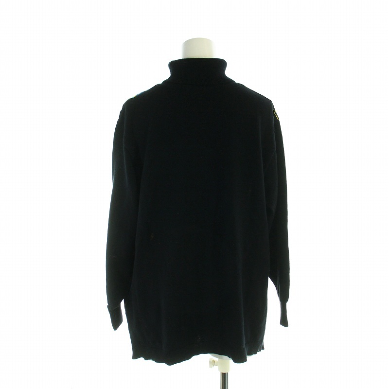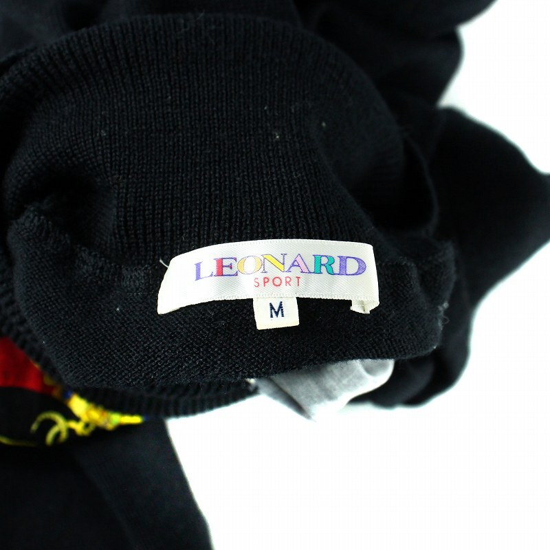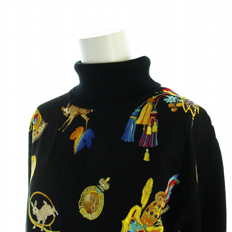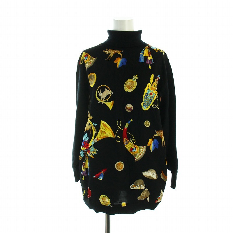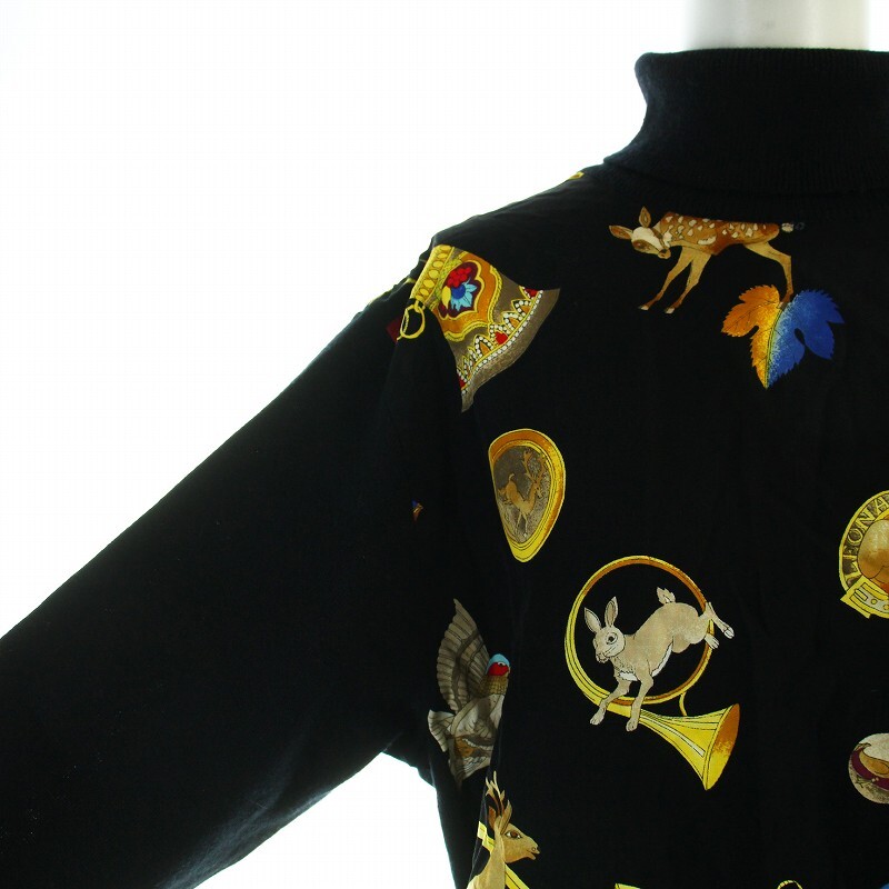 レオナールスポーツ LEONARD SPORT ヴィンテージ カットソー 長袖 ニット切替 タートルネック ハイネック ロゴ 総柄 M 黒