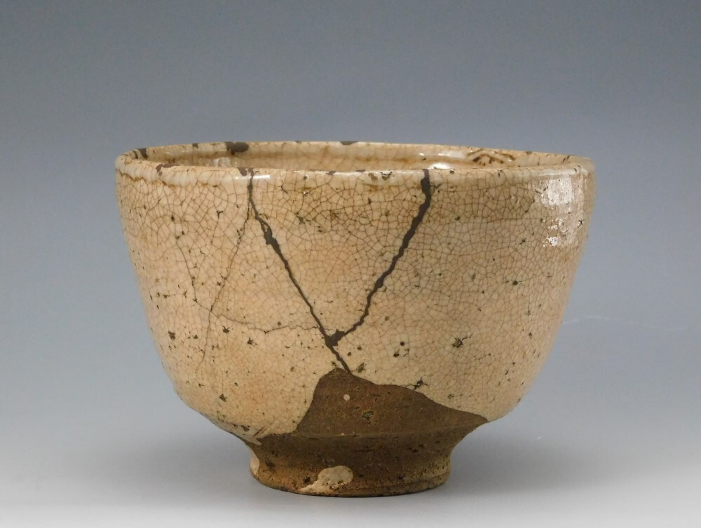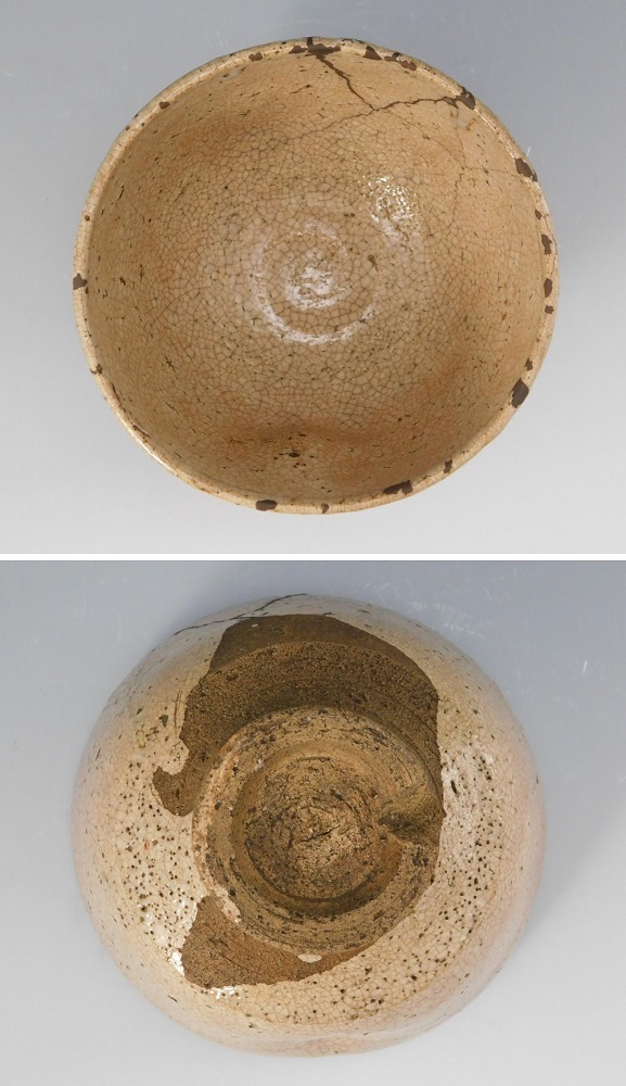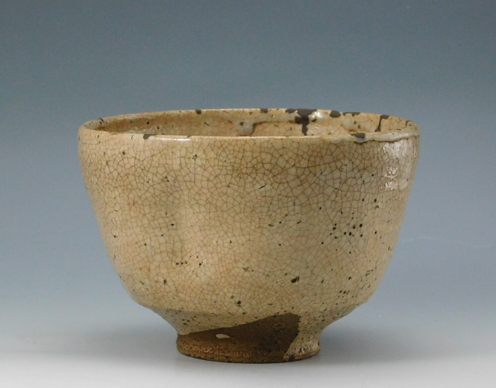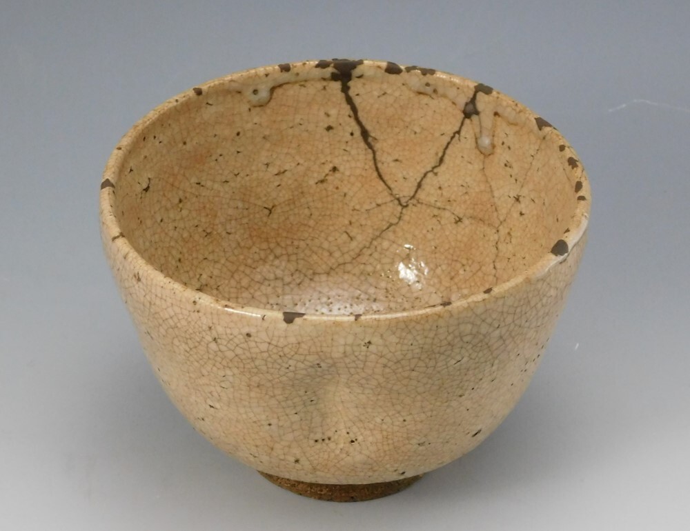 本作は十代坂高麗左衛門が五代の作と鑑定しており、作行は全体に簡素に見えます。しかし胴部に一カ所へこみ(前押せ)があることによって印象は大きく変わり、高台の切れ込みも相まって雅趣が強まり、そのうえに時代による味わいが備わって、それだけでも目が離せなくなるところですが、さらに割れた箇所を補修した、古い直しが侘びた風情を深化させています。