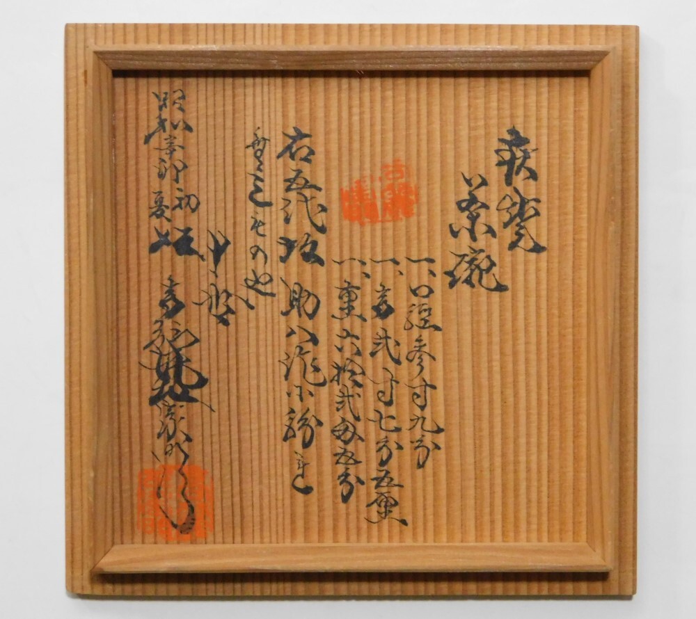 箱書きは子孫である十代坂高麗左衛門であり「萩焼茶碗 口径 三寸九分、高さ 二寸七分五厘、重さ 六十ニ匁五分 右 五代坂助八作に相違なきもの也 昭和辛卯(昭和26年・1951年)初夏 十世 坂高麗左衛門」と極め書きされ、蓋表には「五代 坂助八作 萩焼茶碗」と書かれています。