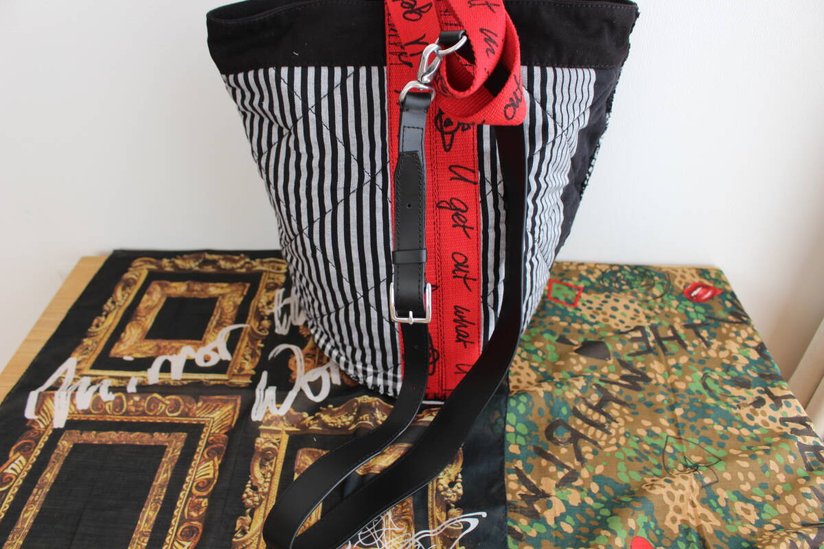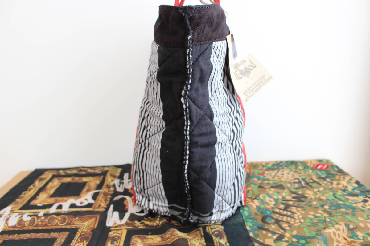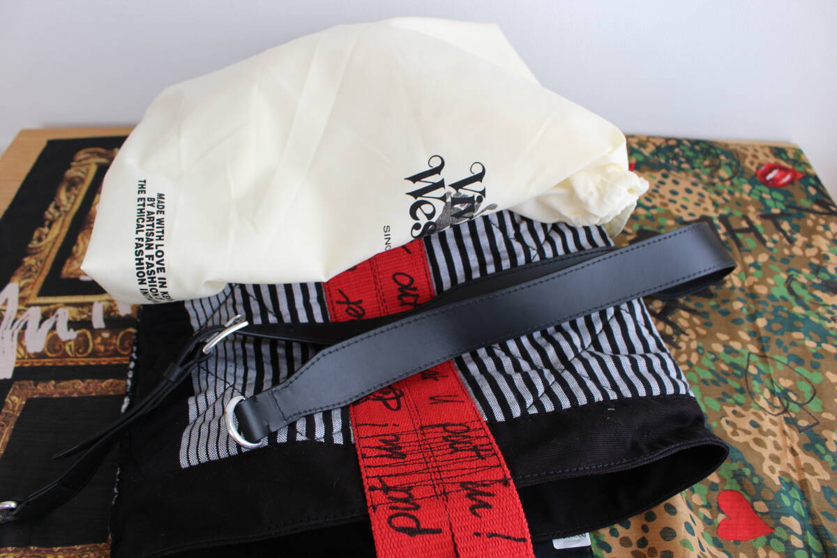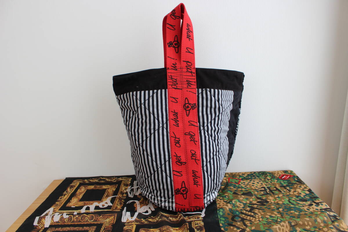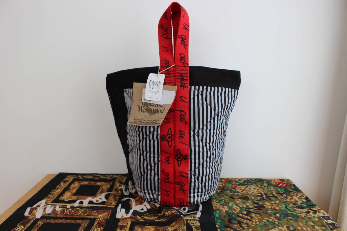 ヴィヴィアン 21ss U GET OUT WHAT U PUT IN! バケットバッグ 商品説明 Vivienne Westwoodのアフリカバッグは、アフリカの一部地域においてビジネスを通じた経済的自立を支援する国連の活動Ethical Fashion InitiativeとVivienne Westwoodの協業により生まれたシリーズです。このシリーズは現地の廃材をリサイクルし、各地域のコミュニティに属する職人の手により、一点ずつ愛を込めて生産されています。 東アフリカの伝統的な織布、キコイ布を使用したバケットバッグ。コットンストライプのキルティング地に、赤のストラップベルトが映えます。Vivienne Westwoodのスローガンがハンドスクリーンでプリントされたベルトもポイントに。 サイズ FREE:縦40 横27 マチ25 持ち手42 ショルダー108-128 仕様 内側:ファスナー付ポケット×1 ショルダー:取外可 定価 ¥59,400(税込)