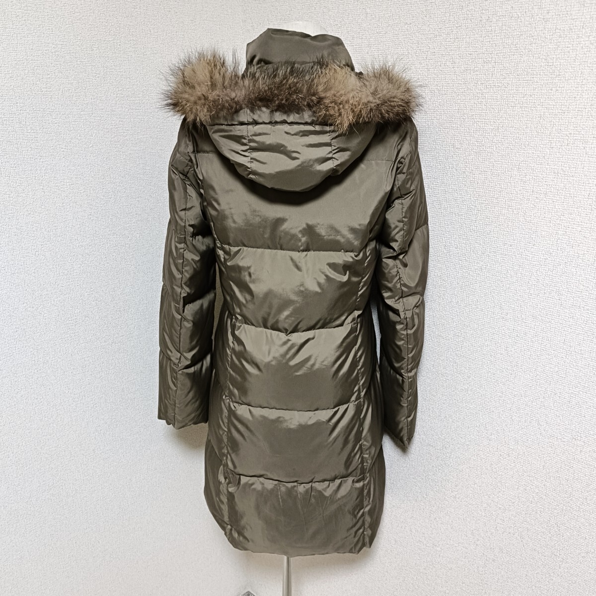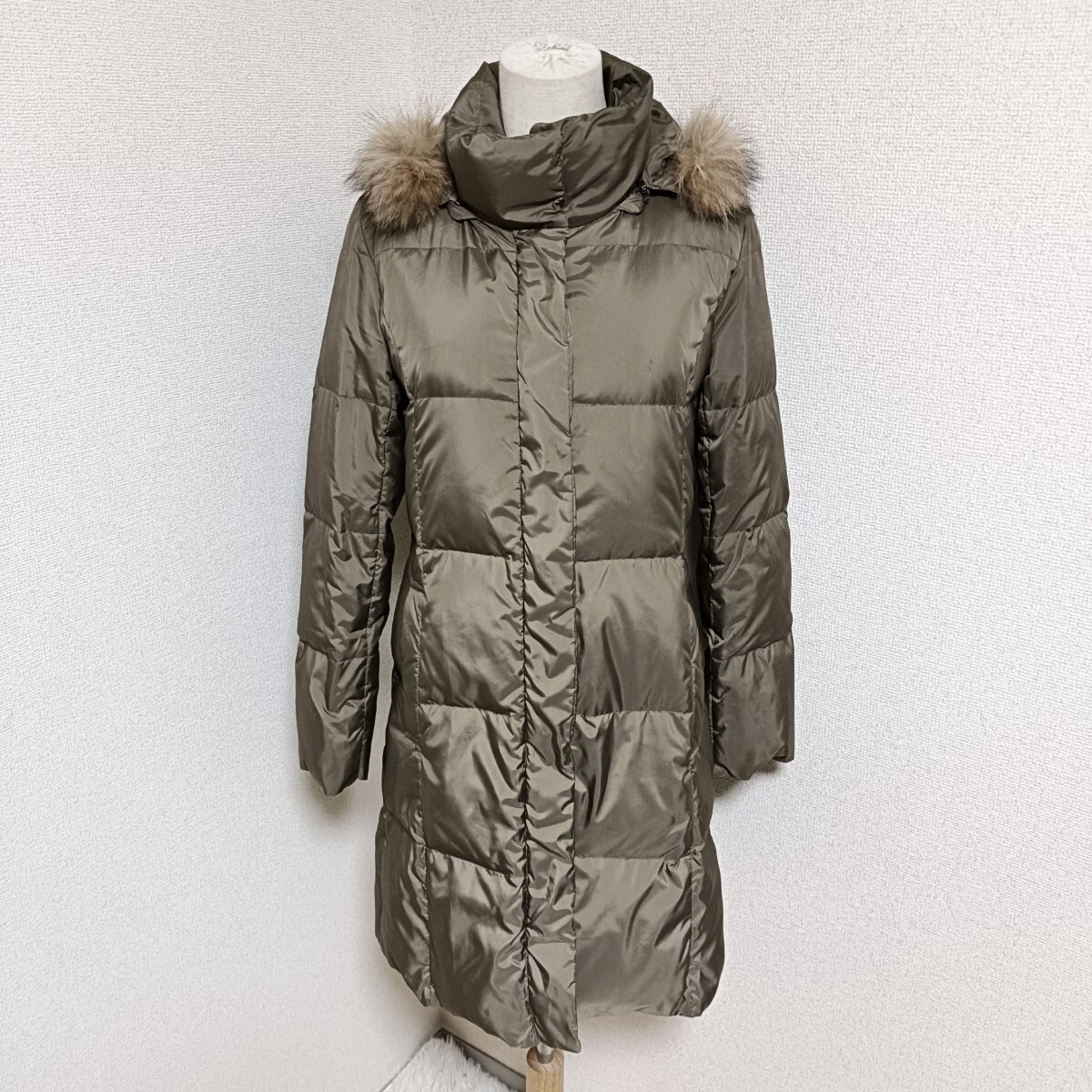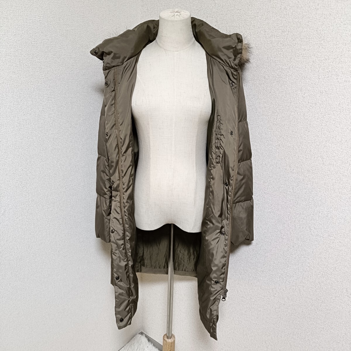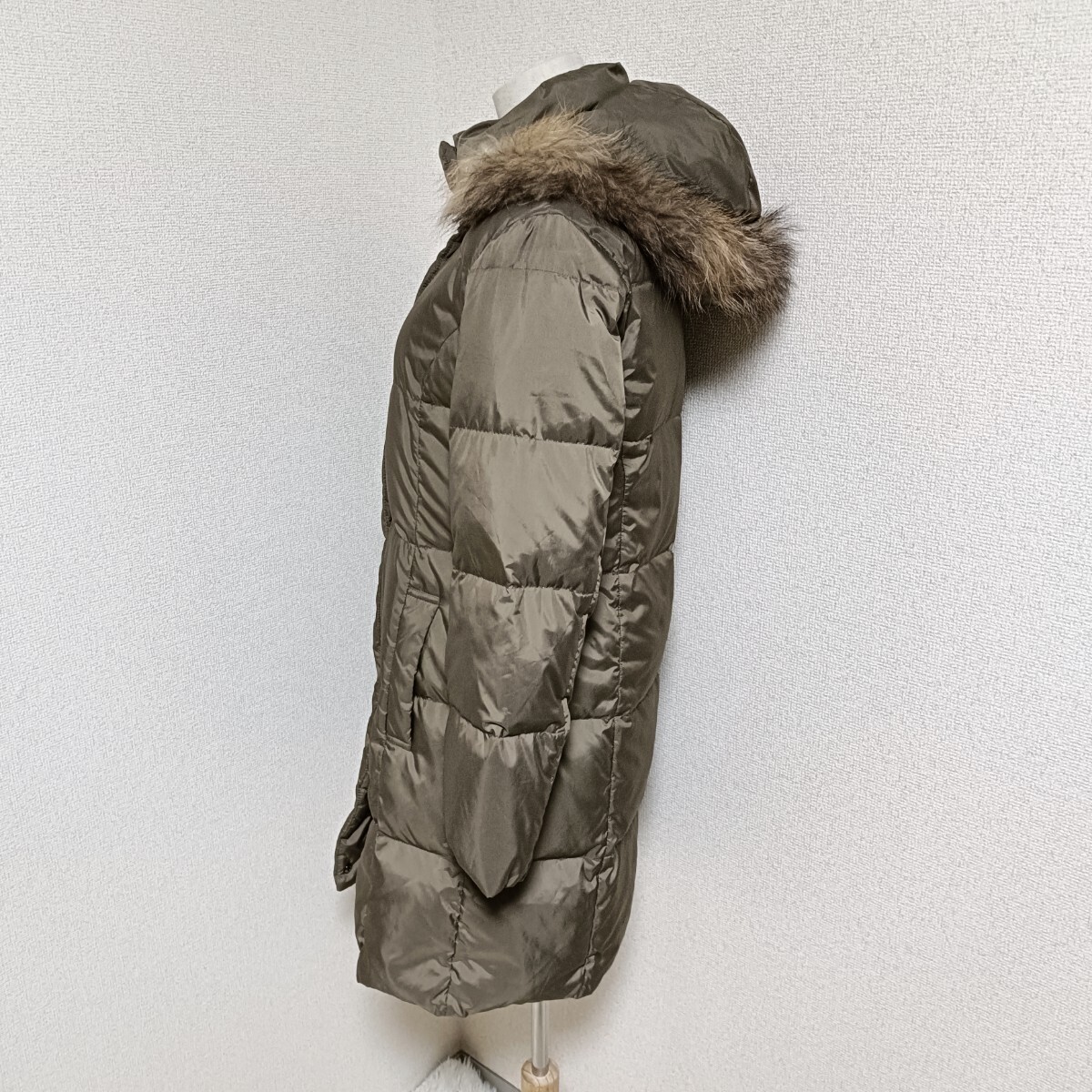 美品 ダウンコート アウター ジップアップ ボタン 着脱フード カーキ フェザー 38 レディース