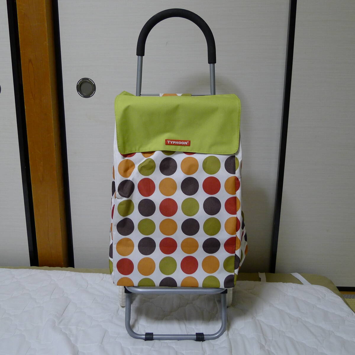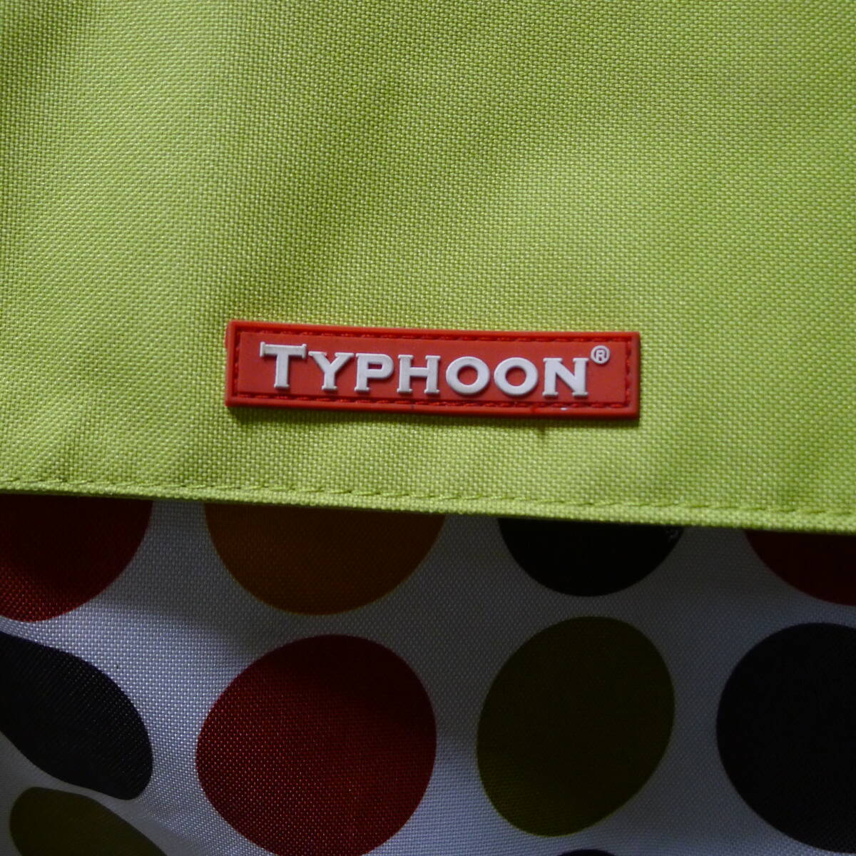 外装:ホワイト地 マルチカラー ドット柄 × イエローグリーン 黄緑色・内装:オフホワイト/2輪キャスター・マジックテープ開閉式・上部長さ調節式コード・背面部ペットボトルポケット×1・オープンポケット×1・前面蓋部「TYPHOON」ロゴタグ など
