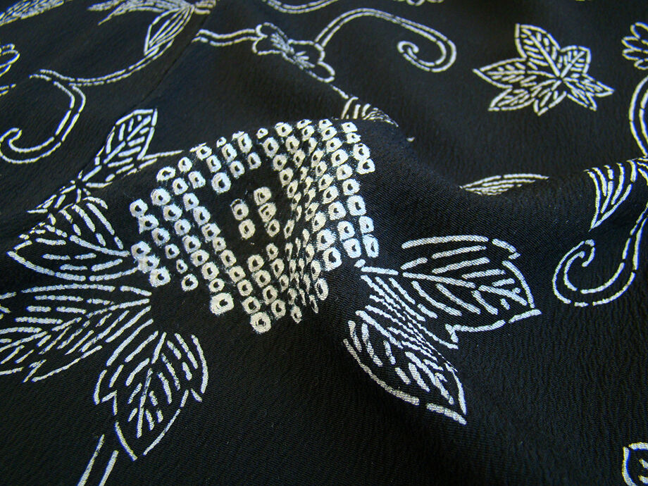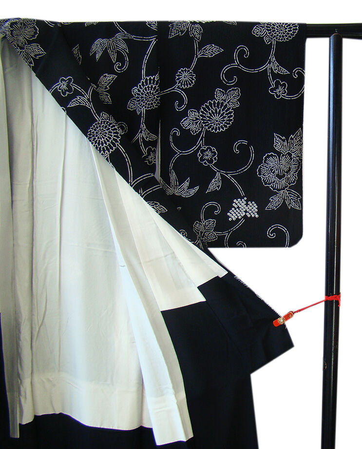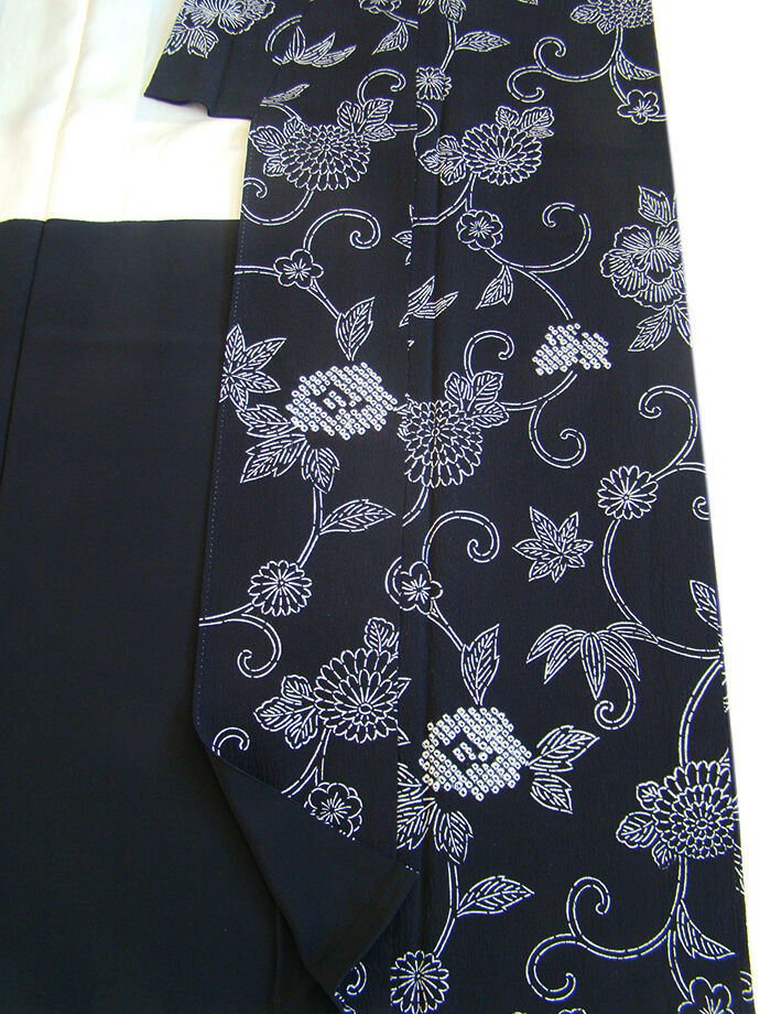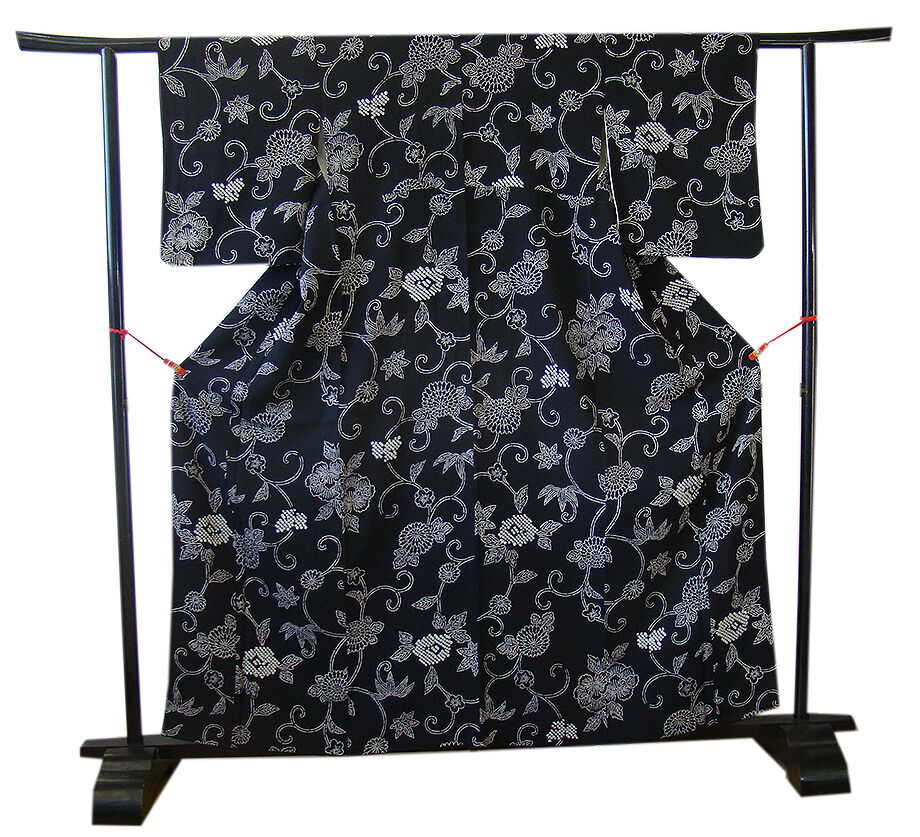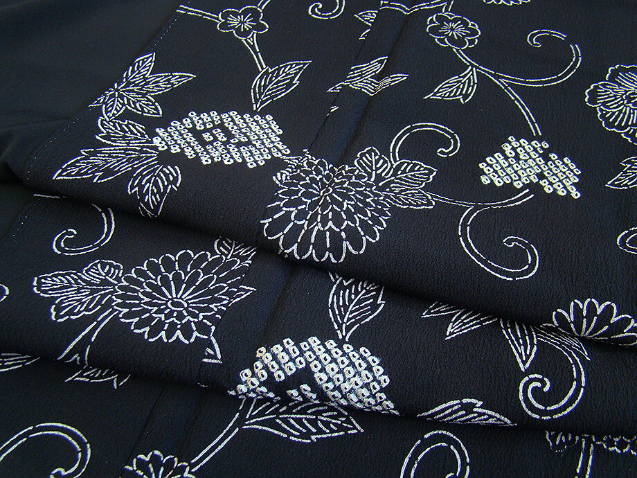 | 商品説明 | こちらのお品は「袷」ですので10月から5月までお召頂ければと思います。 とてもしなやかなぽってりとした手触りの着心地良い重めのちりめん地の生地、 黒色地に白色の花草柄の染柄に鹿の子絞り入り、 八掛は黒色(正絹)、幅広い年代の方にお召頂けます。 |