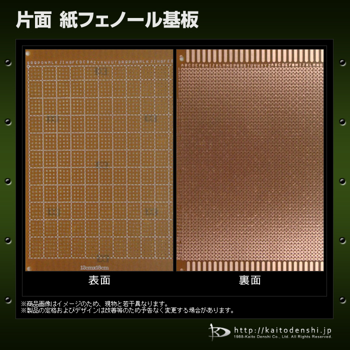 安価で加工性が良いのが特徴です。 (別名ベークライト基板) 基板にある穴に電子部品の脚を差し込み、はんだ付けをしながら自由に回路を組み立て可能。 電子工作の際にご活用ください。 | |