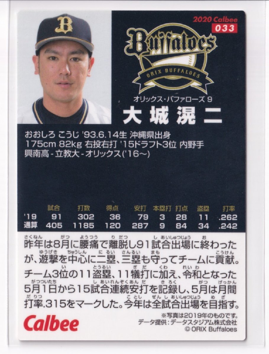2020プロ野球チップス第1弾 33 大城滉二(オリックス)