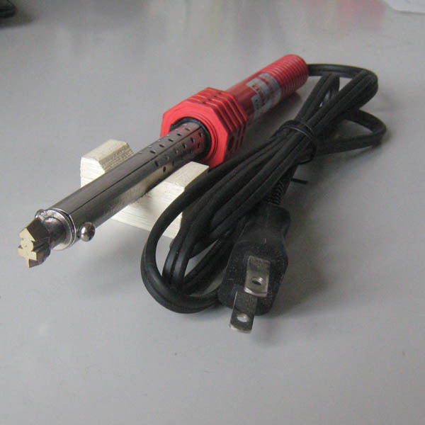商品説明 | 焼印+60W電気ごてのセットです。 到着後すぐに使えるように電気ごてと一体での販売です。 焼印は、パンやお菓子等の柔らかいものにも押せるように 7ミリの深彫の印面を採用しています。 2枚目の画像はベニア板に押したもので、3枚目の画像は厚紙に4枚目は茶色の革に押した時の画像です。 焼印についてのその他の説明はメタルアートのHPを参照下さい。 電気ごては白光製60Wを使用しており軸棒は6ミリです。 専用電気ごて台が付属しています。 又、電気ごてのネジを緩めて、印面を差し替えて使えます ので、1本の電気ごてで何本も併用できます。 発送時に簡単な説明書を同封しております。 前に販売していました電気ごて(780P:80W)が廃盤になりますので 60Wに変更しました。残念ながら前の電気ごてと互換性は ありませんのでご注意下さい。 |