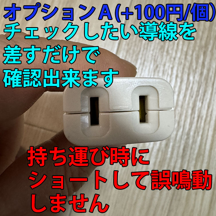 | 商品説明 | 電気工事 配線チェックに 配線テストに 小型 導通ブザー 導通チェッカー スイッチ付き 電池付き 3個セット 小型・軽量・大音量(105~115dB(当方実測値))・スイッチ付き・電池付き 小型なのに大音量! (105~115dB(当方実測値))(写真参照) スイッチ付きで持ち運び時事の誤鳴動やスイッチを切る事で電池の消耗を削減出来ます。(写真参照) 他のブザーとクリップが違います! 大きく、クリップの強度もありますので ケーブルにクリップしたままでぶら下げることができます。本体上部からケーブルを引き出していますのでケーブルにぶら下げてもバランスが良いです。クリップは大型で、ちゃんとハンダ付けし、根本をかしめているのでされているので断線の心配もありません。 長さ60mm、開口範囲10mm(写真参照) ケーブルの長さは130~140mm オプションとしてコンセントプラグオスとメスを用意しています。 ワニクチクリップの代わりにコンセントプラグに変更が可能ですが、 価格が変更になるので御希望の方は購入前にメッセージを下さい。 専用を作成致します。またケーブルの長さをカスタマイズも可能です。御希望の方は購入前にコメントして下さい。 ケーブル取り出し口はチューブでまとめ内部でコーキングして断線などしない様に処理しています。 大音量なので離れた場所での導通チェックができます。 一人作業でも導通チェックが可能です。 電気工事、通信工、弱電、消防設備士、空調関係の仕事されてる方、導通チェックにオススメです。 小型ですのでポケットに入りますし、腰袋や工具袋 に入れても邪魔になりません。 使用電池は、ボタン電池 LR44 3個 で テスト用電池が内蔵されています。 簡単な説明書も添付致します。 ハンドメイド商品になりますので神経質な方は購入お控えください。 プションとしてコンセントプラグオスとメスを用意しています。 ワニクチクリップの代わりにコンセントプラグに変更が可能ですが、 価格が変更になるので御希望の方は購入前に質問でメッセージを下さい。 専用を作成致します。またケーブルの長さをカスタマイズも可能です。御希望の方は購入前に質問でコメントして下さい。 簡易的な領収書の発行可能です。 |