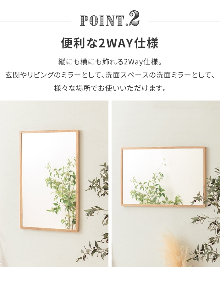 | 耐久性があり高級木材の一つとされる、美しく個性的な雰囲気を持つ天然木(オーク)の無垢材を使用したウォールミラー。 縦にも横にも飾れる2Way仕様。 3mm厚の飛散防止ミラーを使用しているので安心。 玄関やリビングのミラーとして、洗面スペースの洗面ミラーとして、様々な場所で飾れるミラー。 |