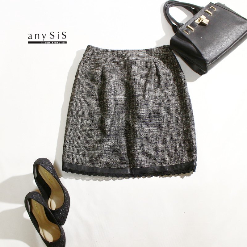 美品 エニィスィス any SiS 組曲 株)オンワード樫山 飾レザー ラメツイードスカート 9号 2 ブラック 黒 通勤 オフィス フォーマル 綺麗め