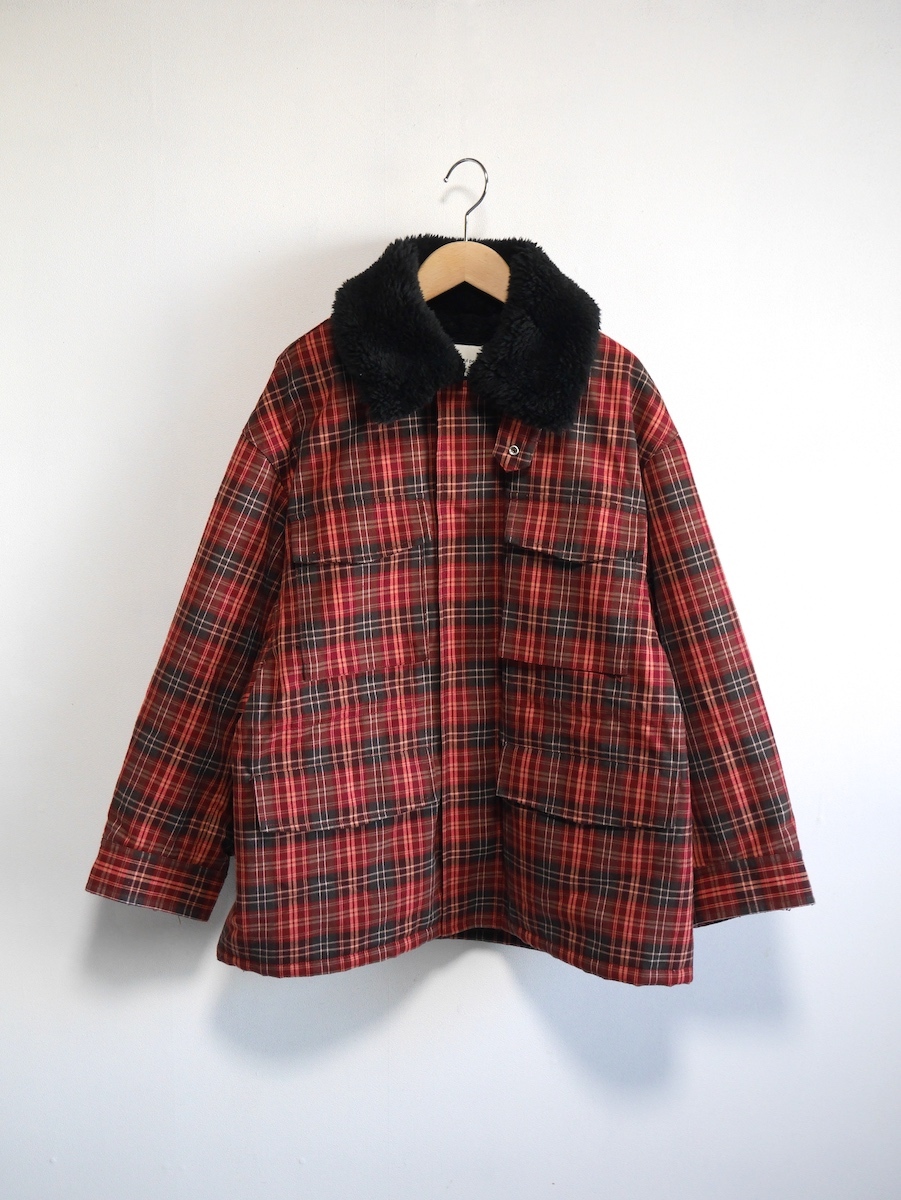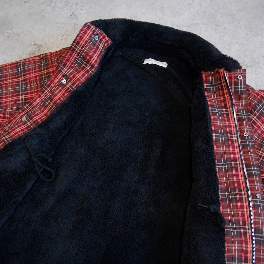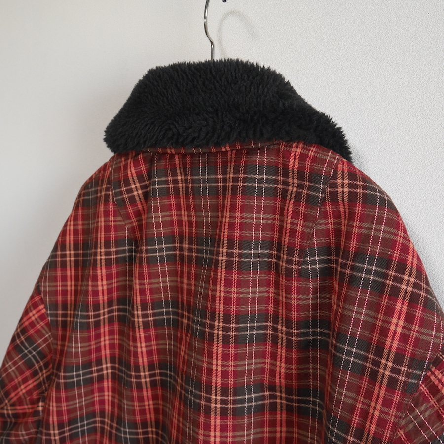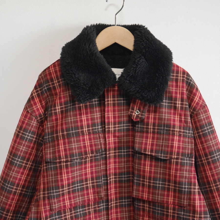 ゆったりとしたサイジングのボア衿ワークブルゾン。 表地はネルシャツを思わせる起毛チェック素材。裏地には柔らかなボア素材を使用。 袖裏はキルティング仕立て。後ろにボリュームを持たせた立体感のあるシルエットとボリューム感が特徴です。 ユニセックスで着ていただけます。