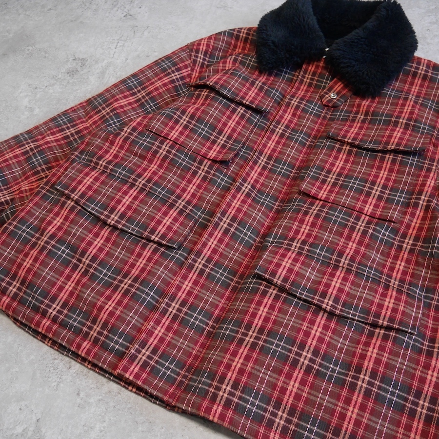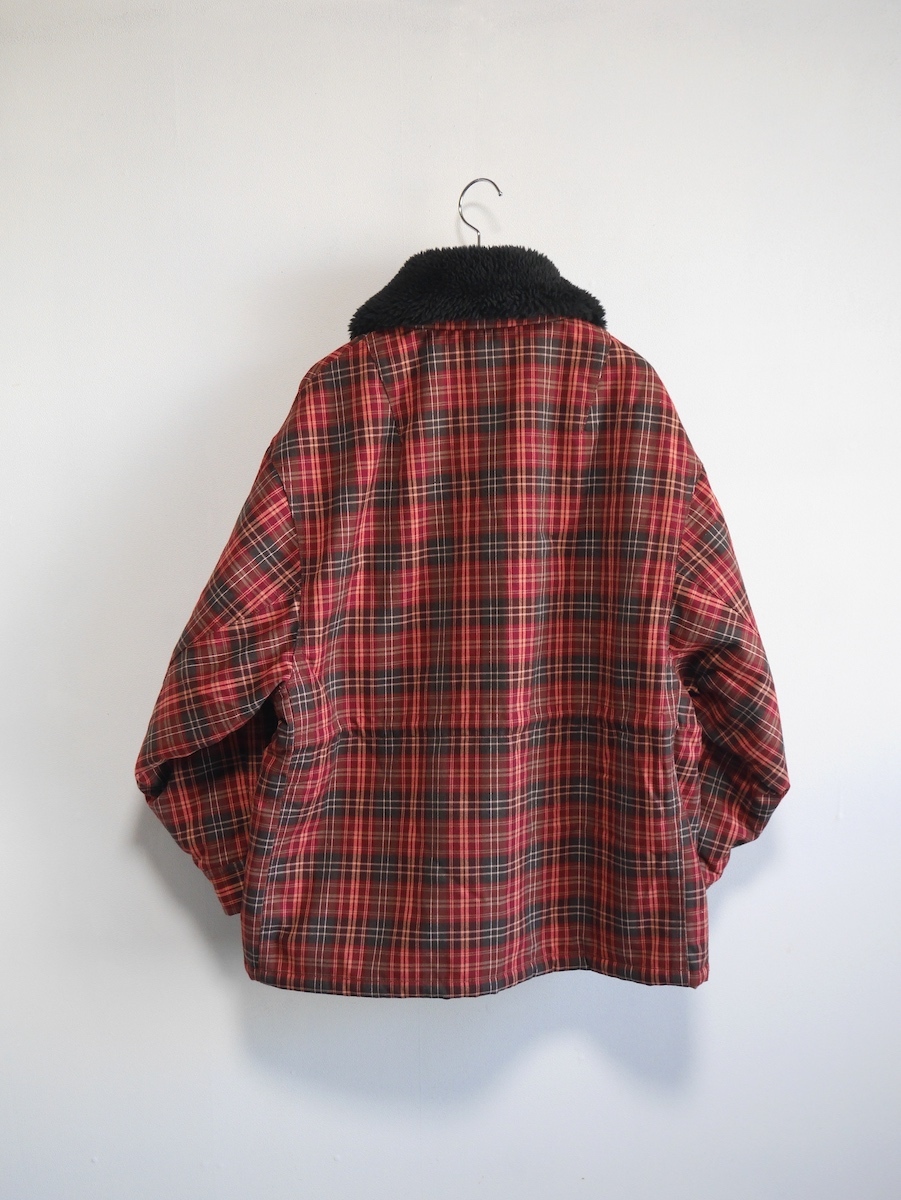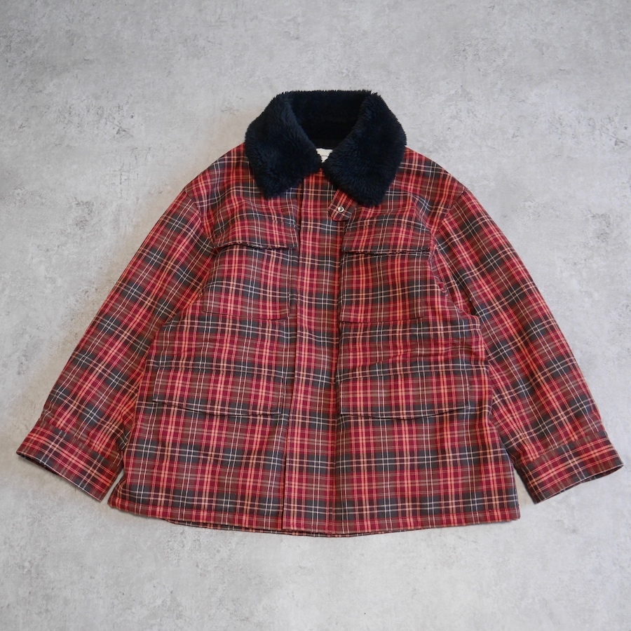 ゆったりとしたサイジングのボア衿ワークブルゾン。 表地はネルシャツを思わせる起毛チェック素材。裏地には柔らかなボア素材を使用。 袖裏はキルティング仕立て。後ろにボリュームを持たせた立体感のあるシルエットとボリューム感が特徴です。 ユニセックスで着ていただけます。