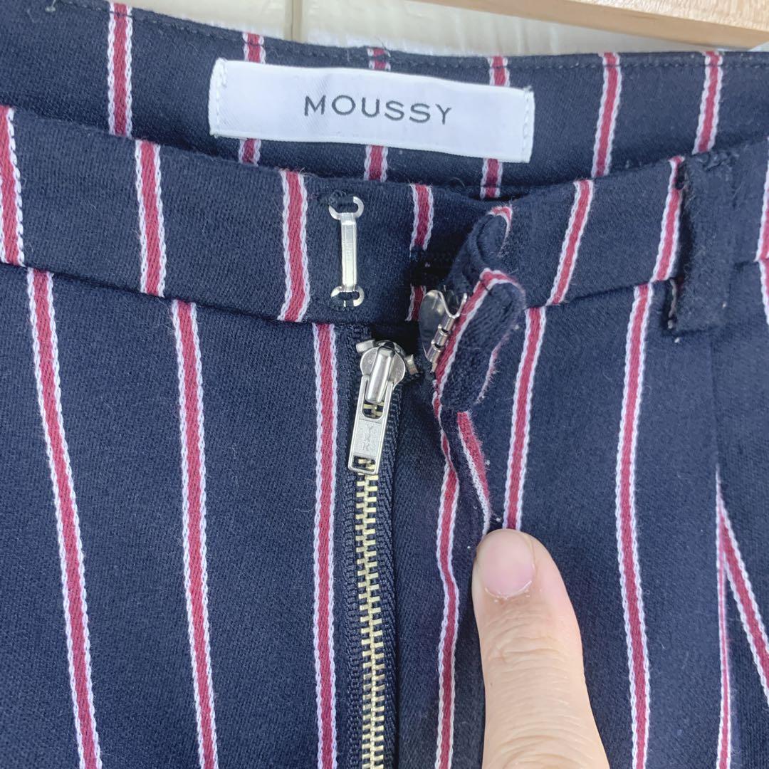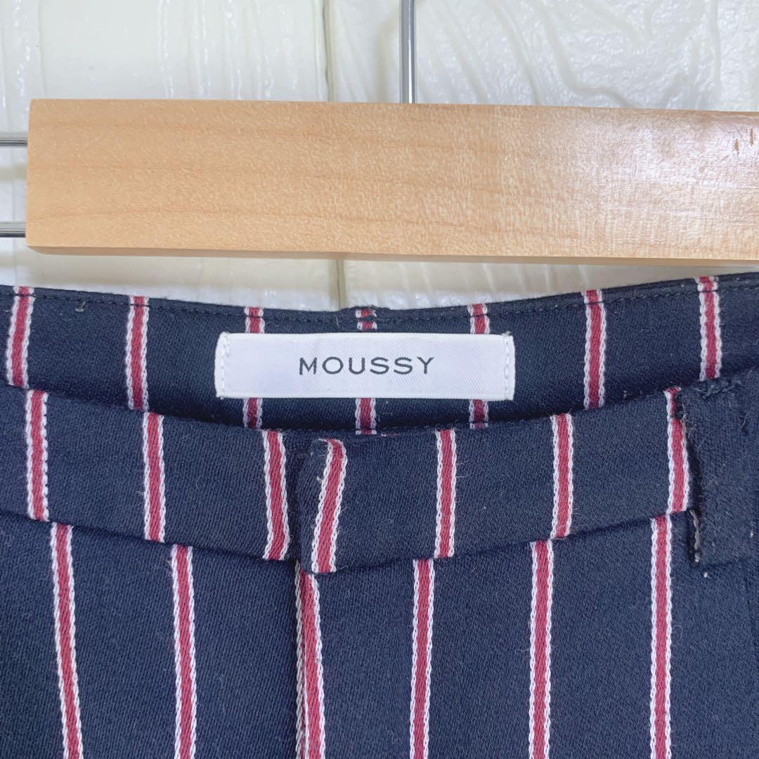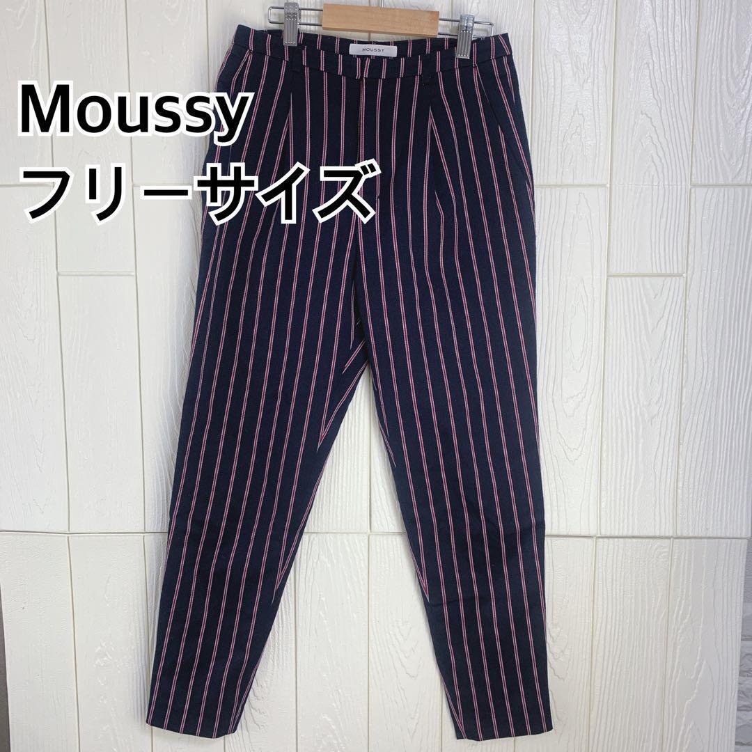 Moussyのフリーサイズストライプパンツは、ネイビーとレッドのストライプが特徴です。どんなトップスとも合わせやすく、カジュアルからフォーマルまで幅広く活躍します。