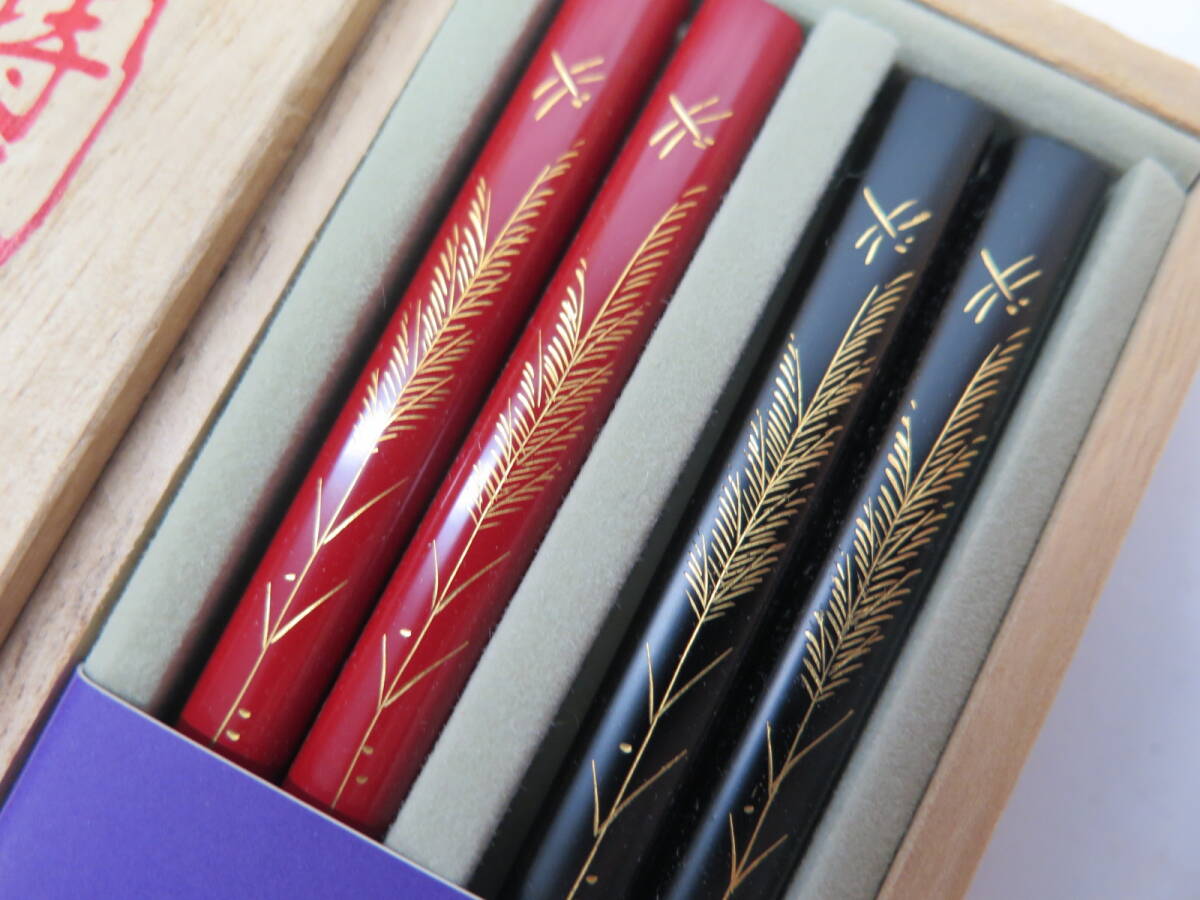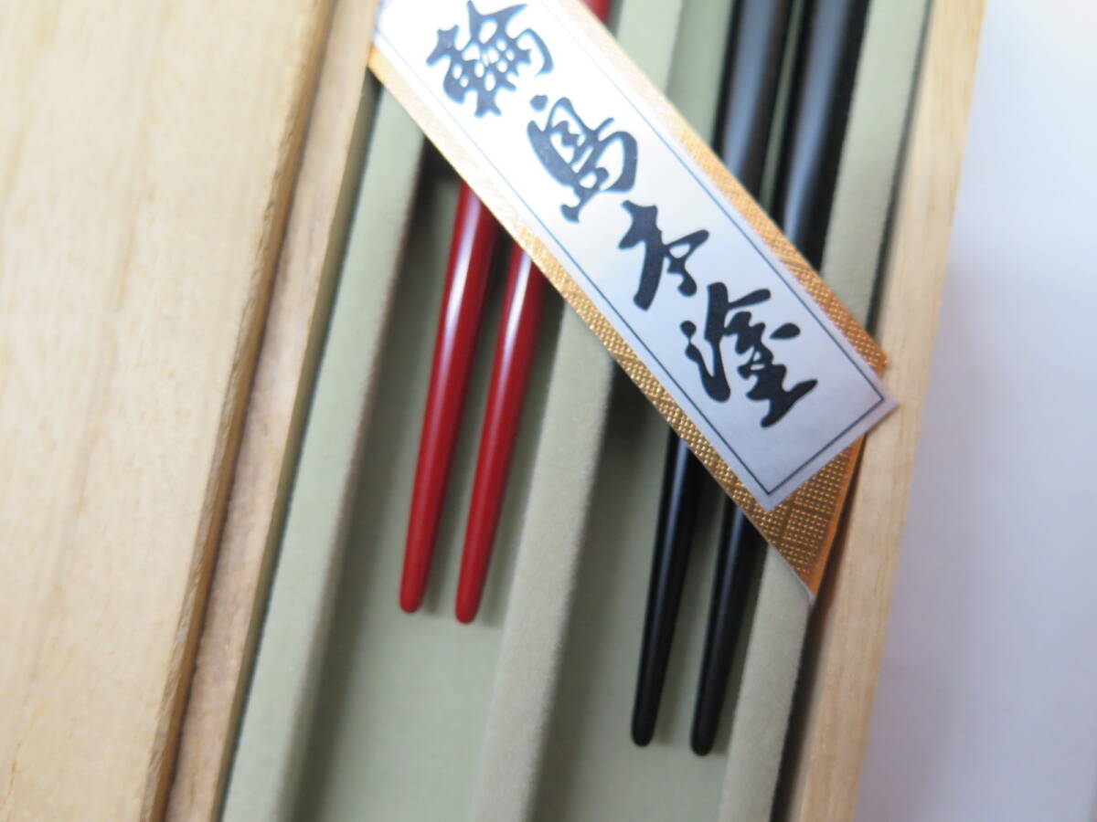 夫婦箸には「天然漆 天然木」の表示が付いていますが塗り箸の方は表示がございません。