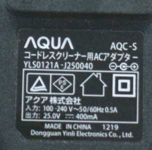アクア AQUA コードレス 掃除機 クリーナー 純正 ACアダプター AQC-S YLS0121A-J250040 25V 25.0V 400mA 0.4A ★動作OK