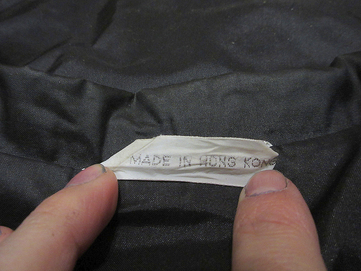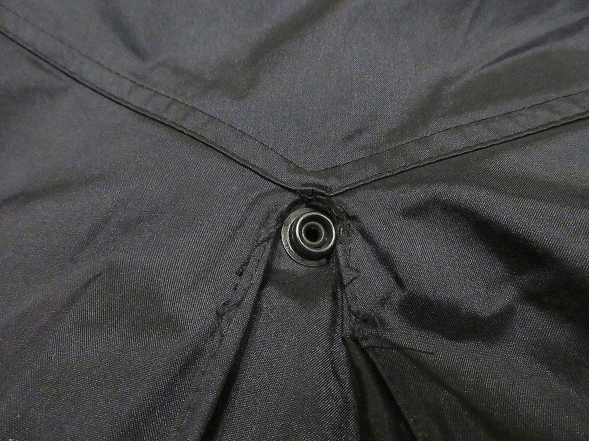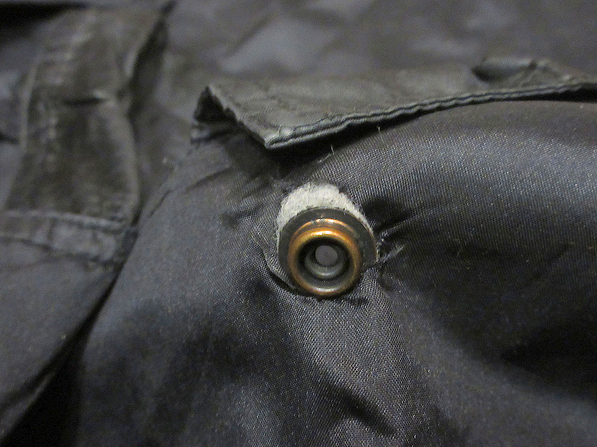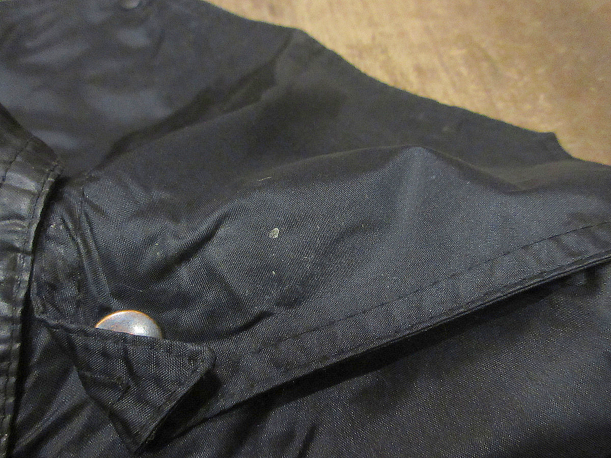 スナップボタンの付け根に破れやダメージのある箇所あり、点々と汚れやステッチのほつれあり