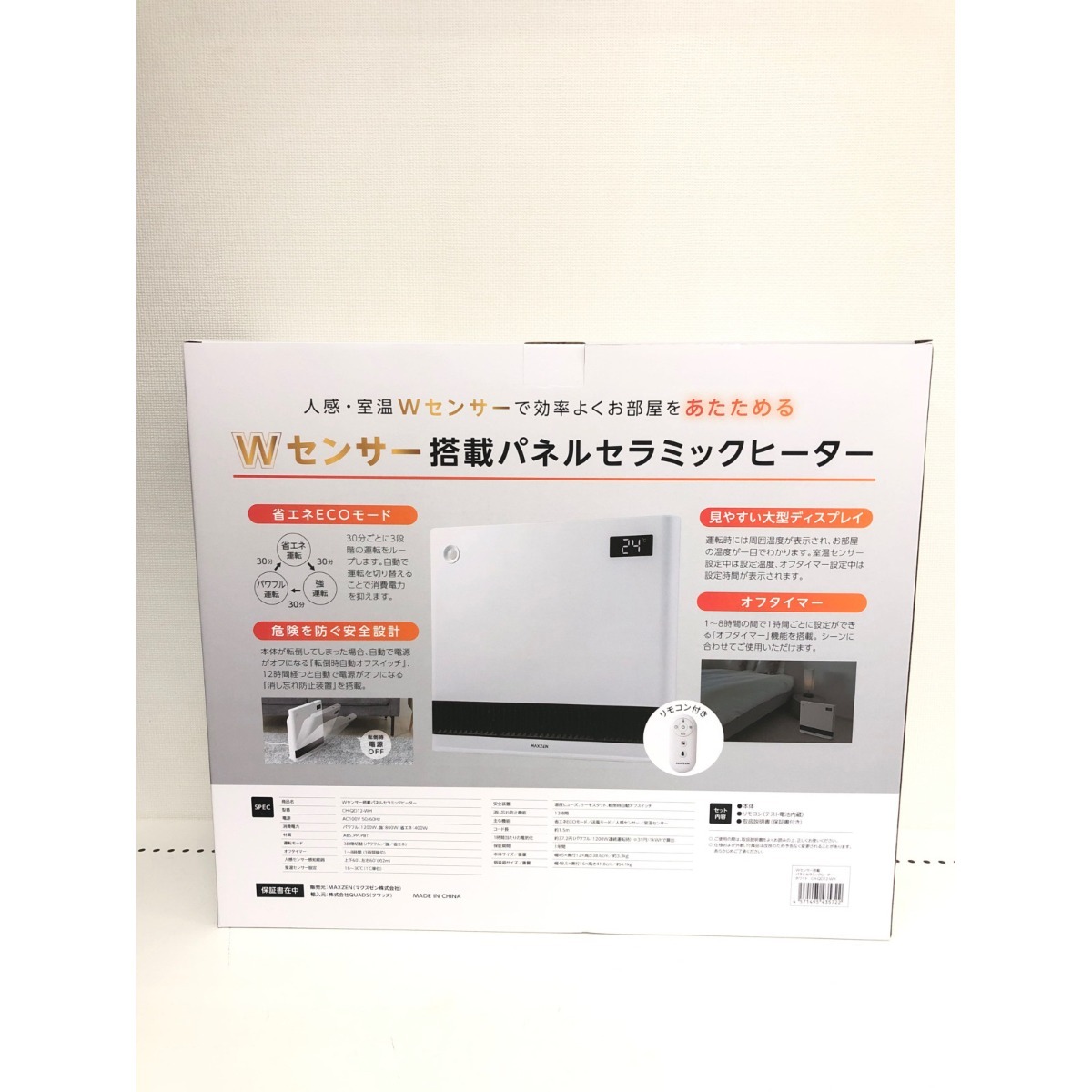 ▼▼ MAXZEN Wセンサー搭載 パネルセラミックヒーター リモコン付き 暖房 電気暖房 人感センサー搭載 2024年製 CH-QD12 未使用に近い