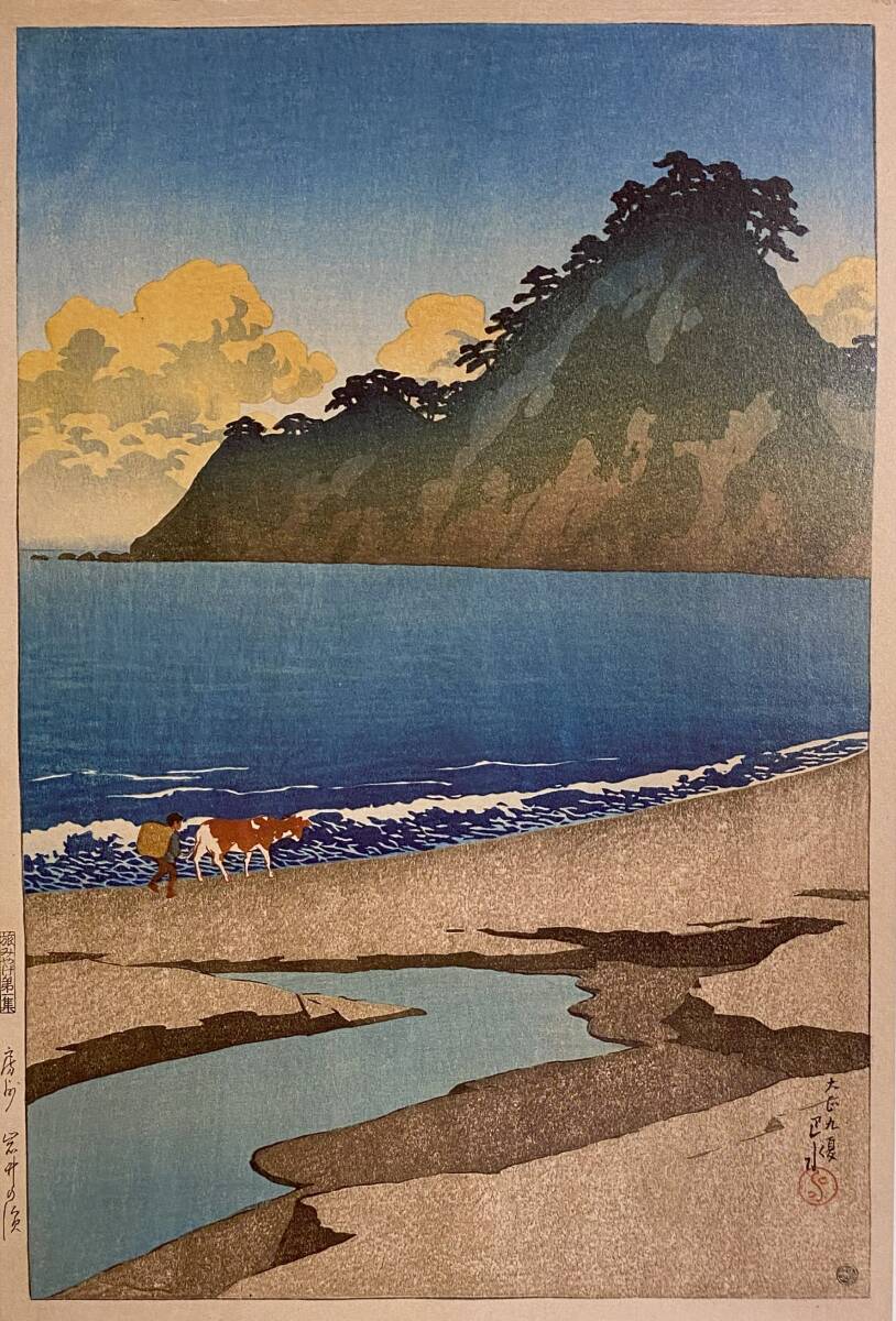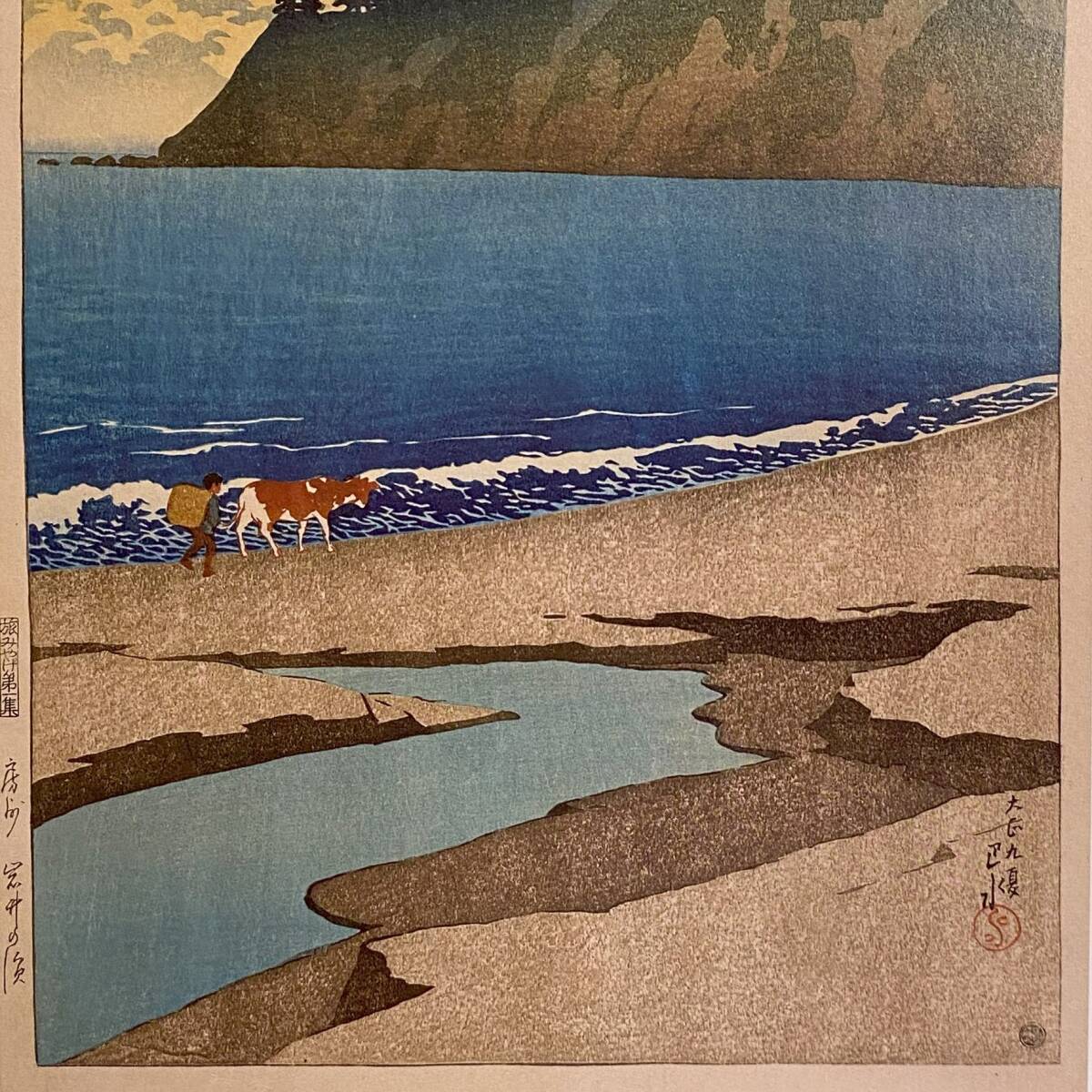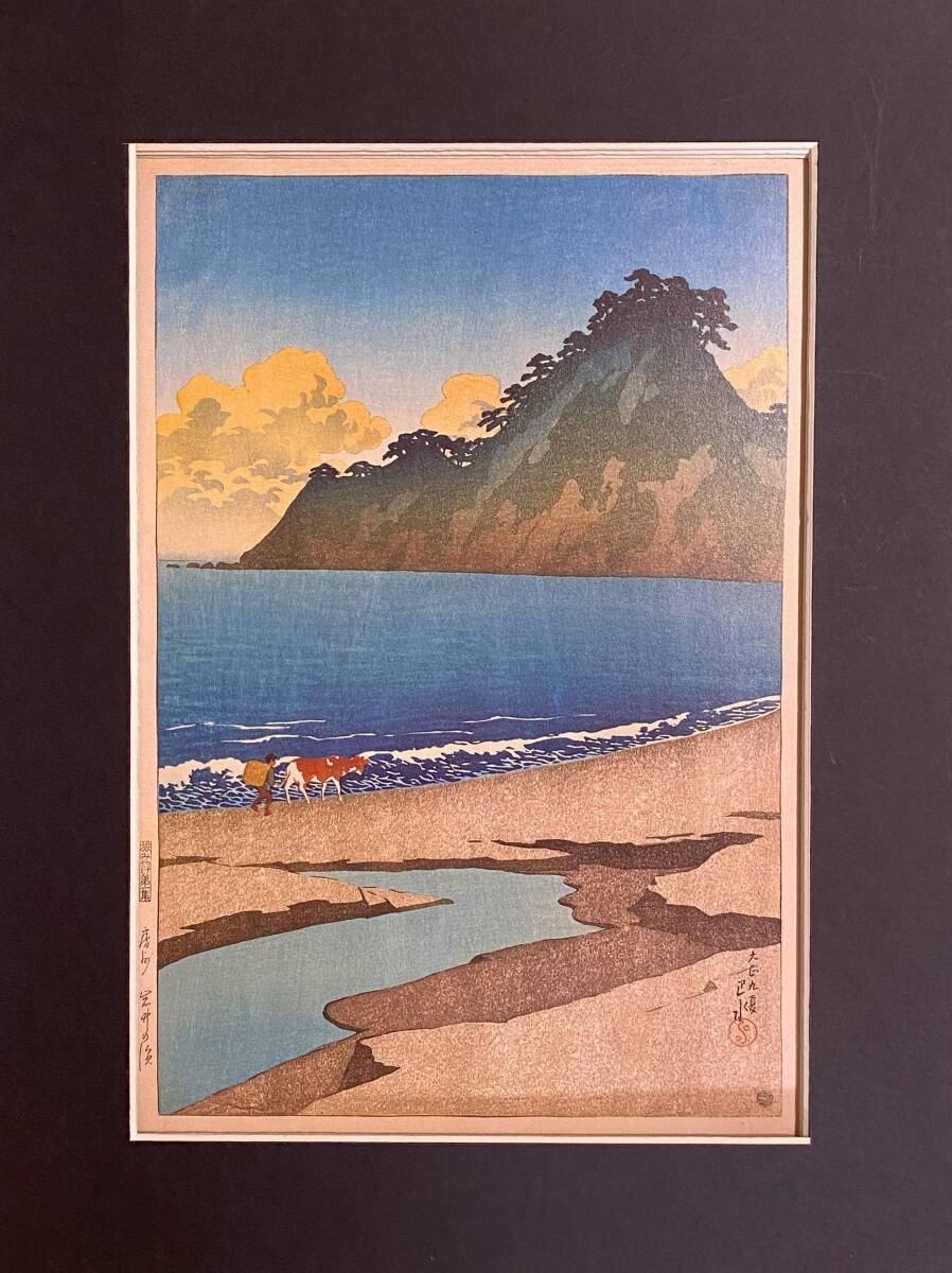 川瀬巴水、〈房州岩井の浜 旅みやげ第一集〉、希少画集画、高級新品額・額装付、状態良好、送料込み