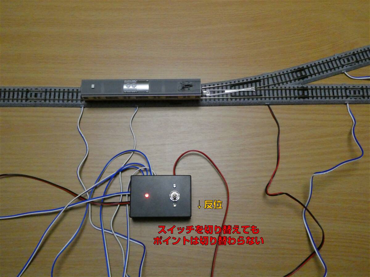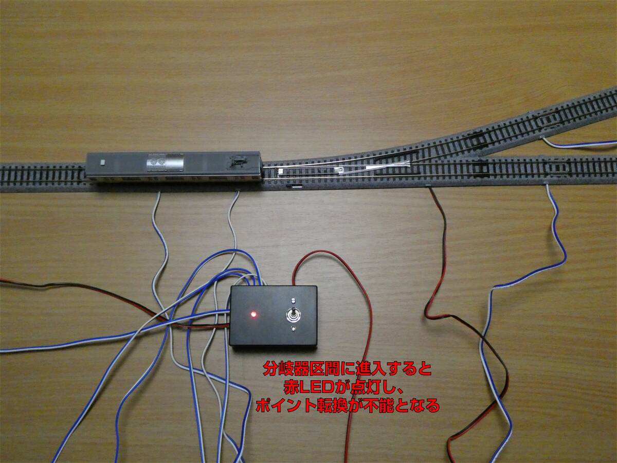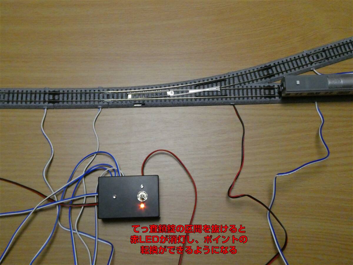 車両がポイントを通過している間は赤色LEDが点灯し、ポイントの転換操作ができない「てっ査鎖錠」がかかります。