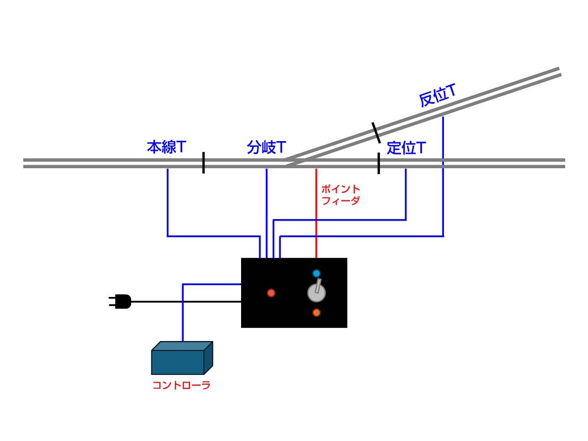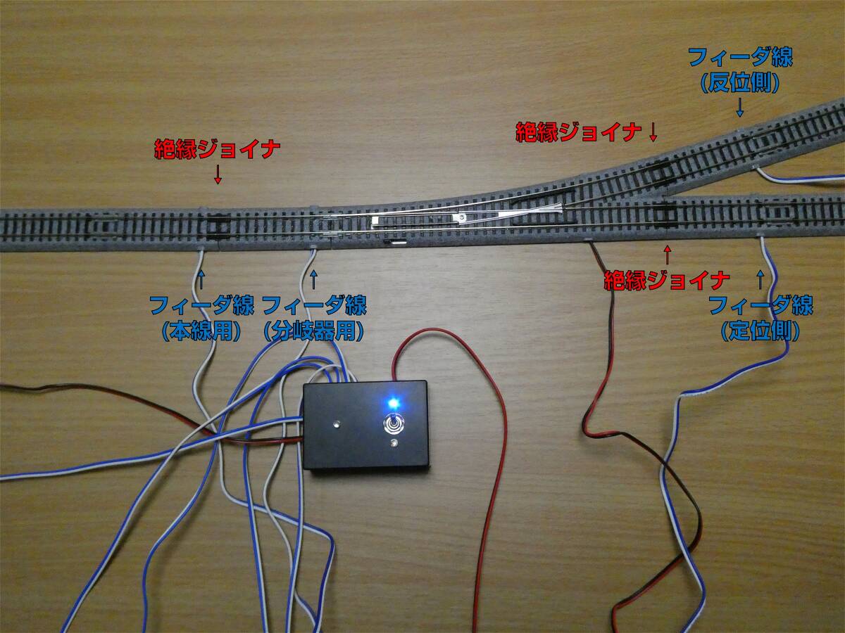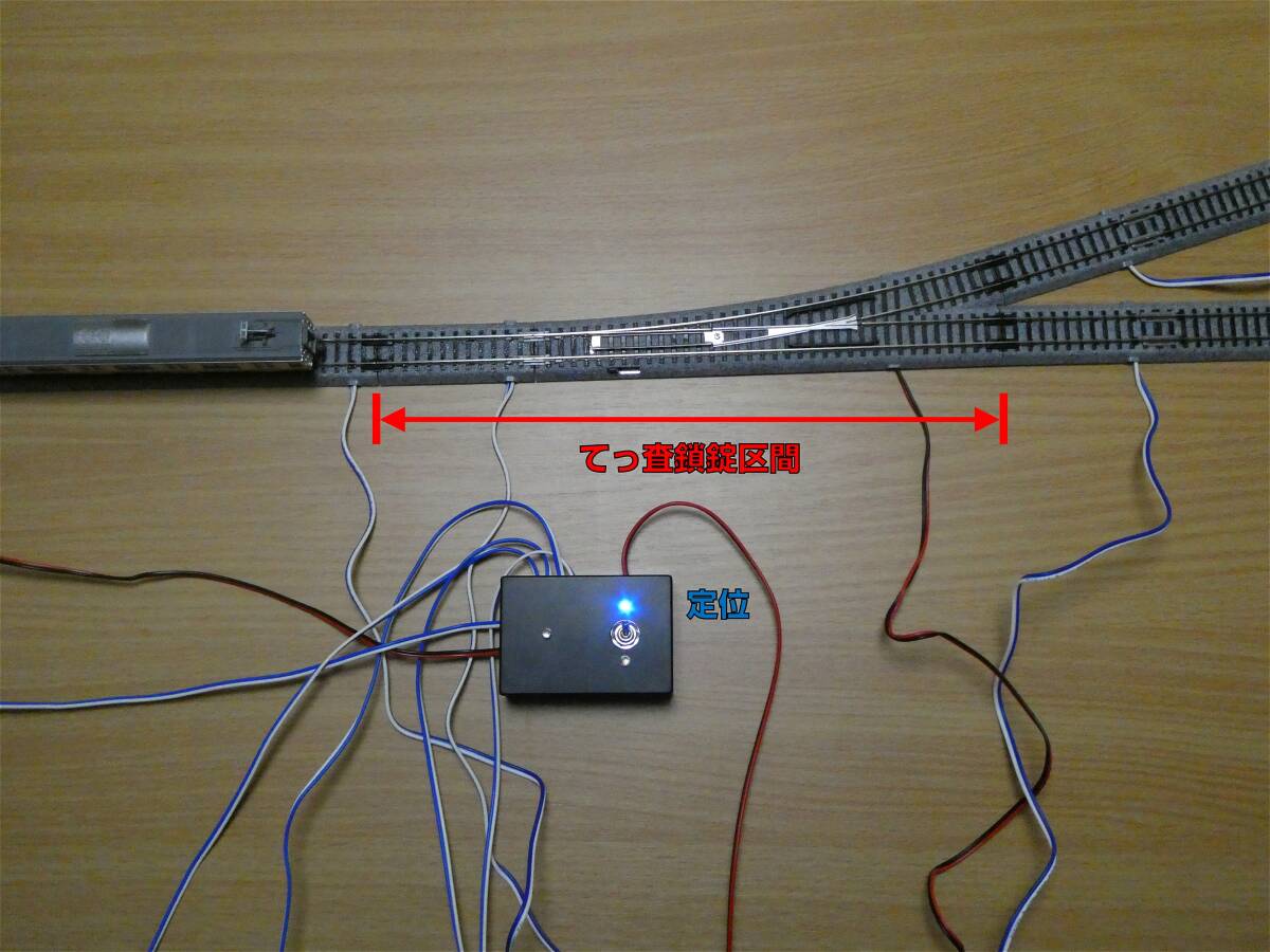 フィーダ線をポイントの合流部と、ポイントの前後に計4箇所挿入し、絶縁ジョイナで軌道回路を分けることによって、てっ査鎖錠のポイントスイッチとして動作します。