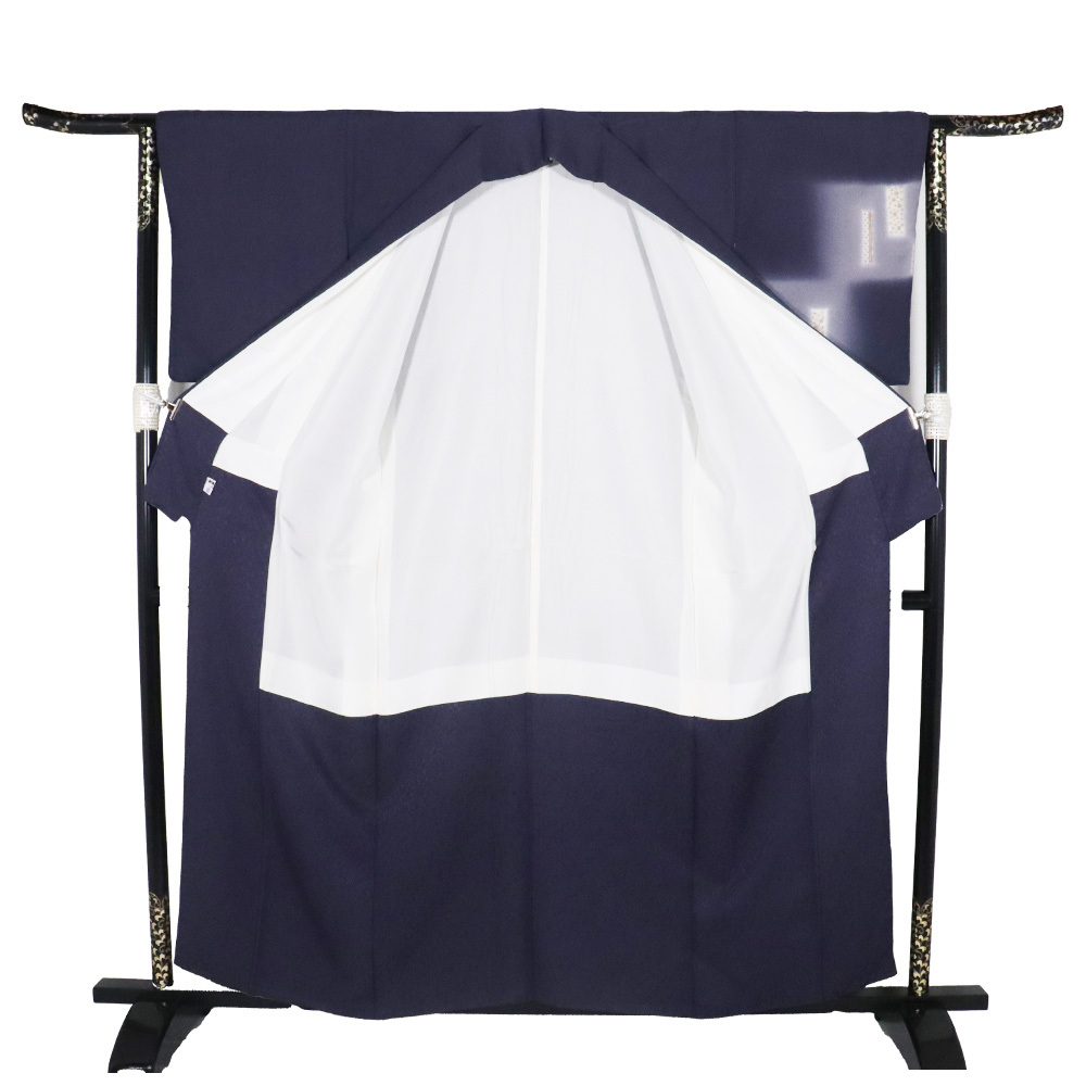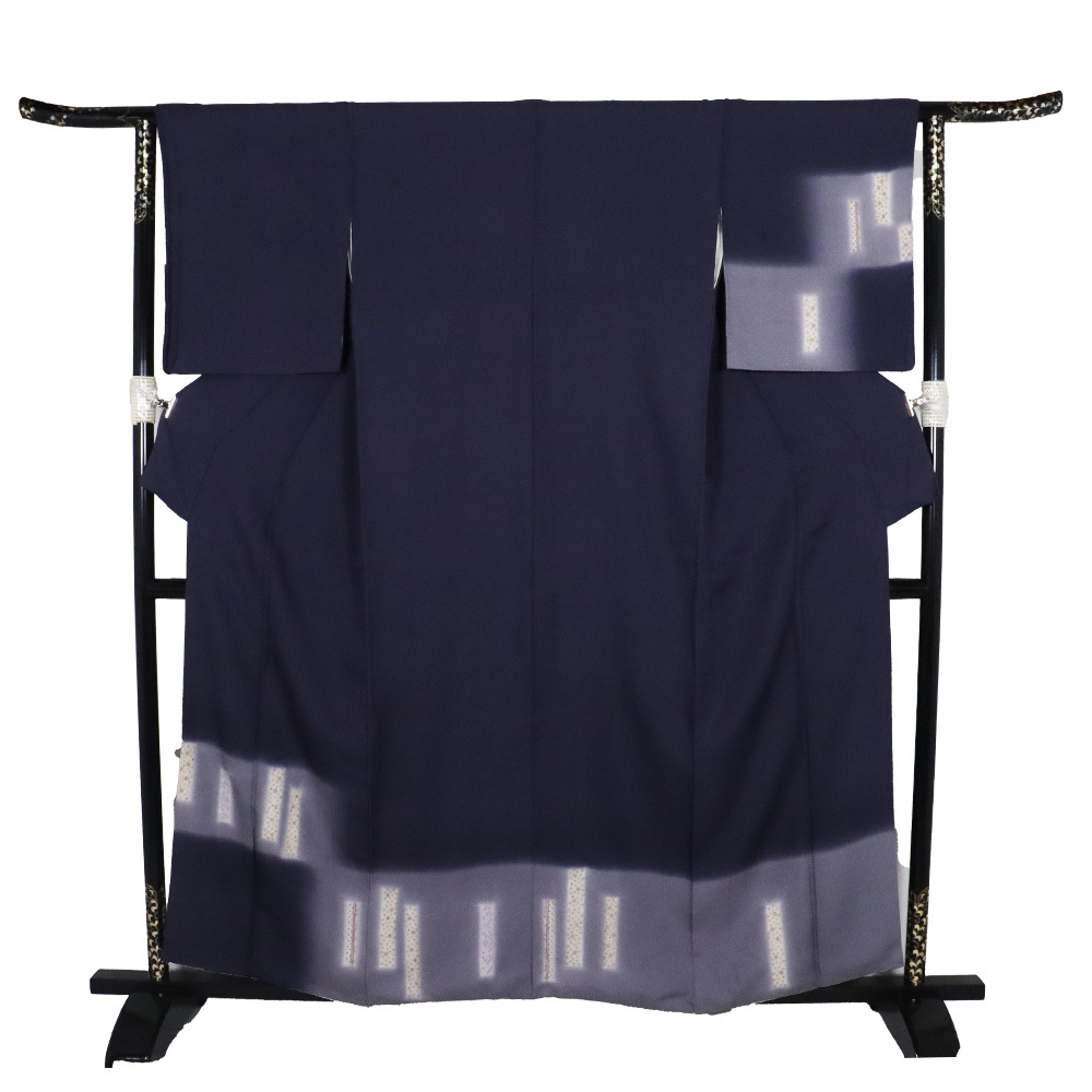 | 訪問着 袷 丹後縮緬地 紺(濃藍)・薄グレー(薄色)・暈し地 刺繍・小花・短冊文 165 広襟 | |