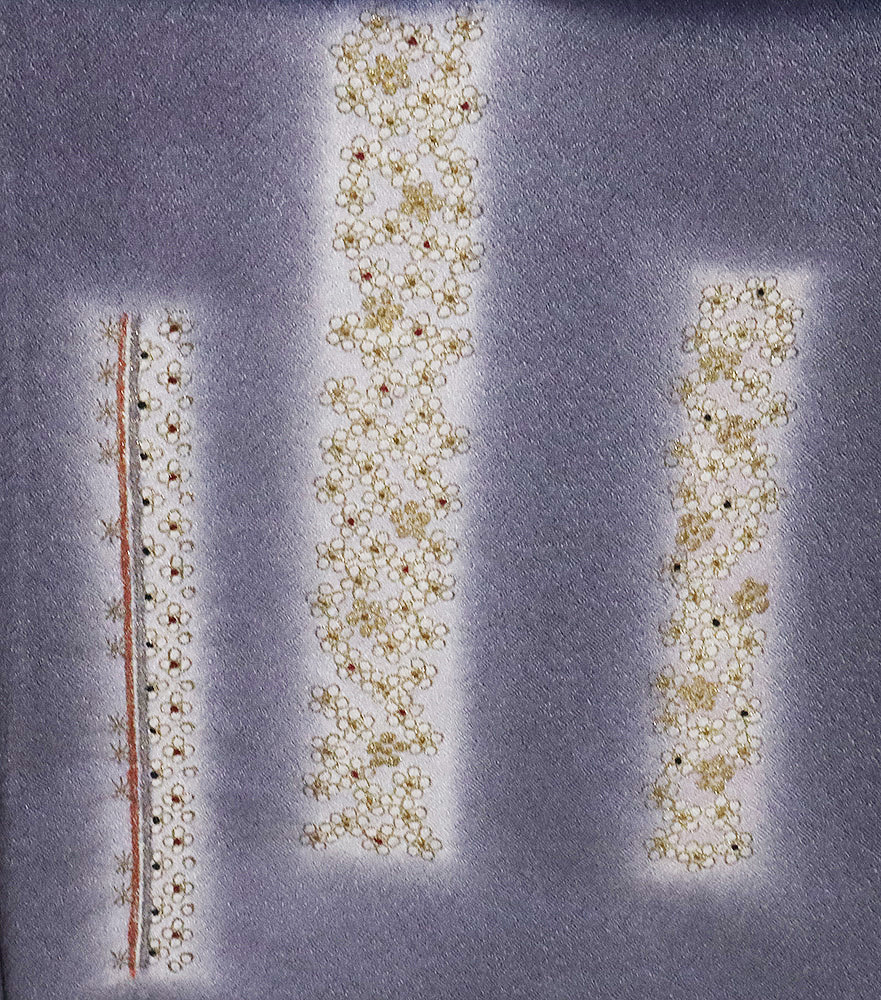 | 色・柄 | 訪問着 袷 丹後縮緬地 紺(濃藍)・薄グレー(薄色)・暈し地 刺繍・小花・短冊文 (写真では上手く色が出ない場合があります。ご了承下さい) |