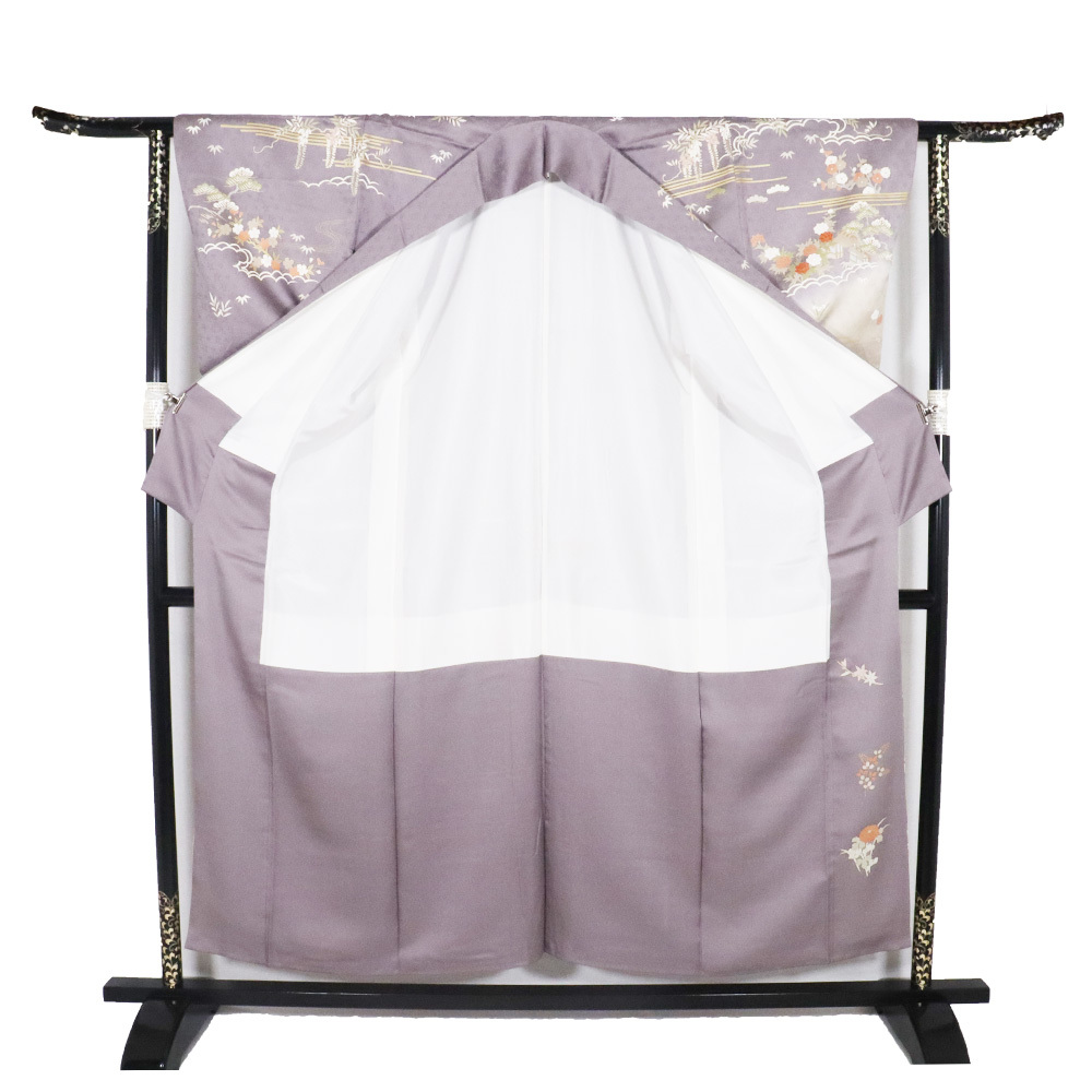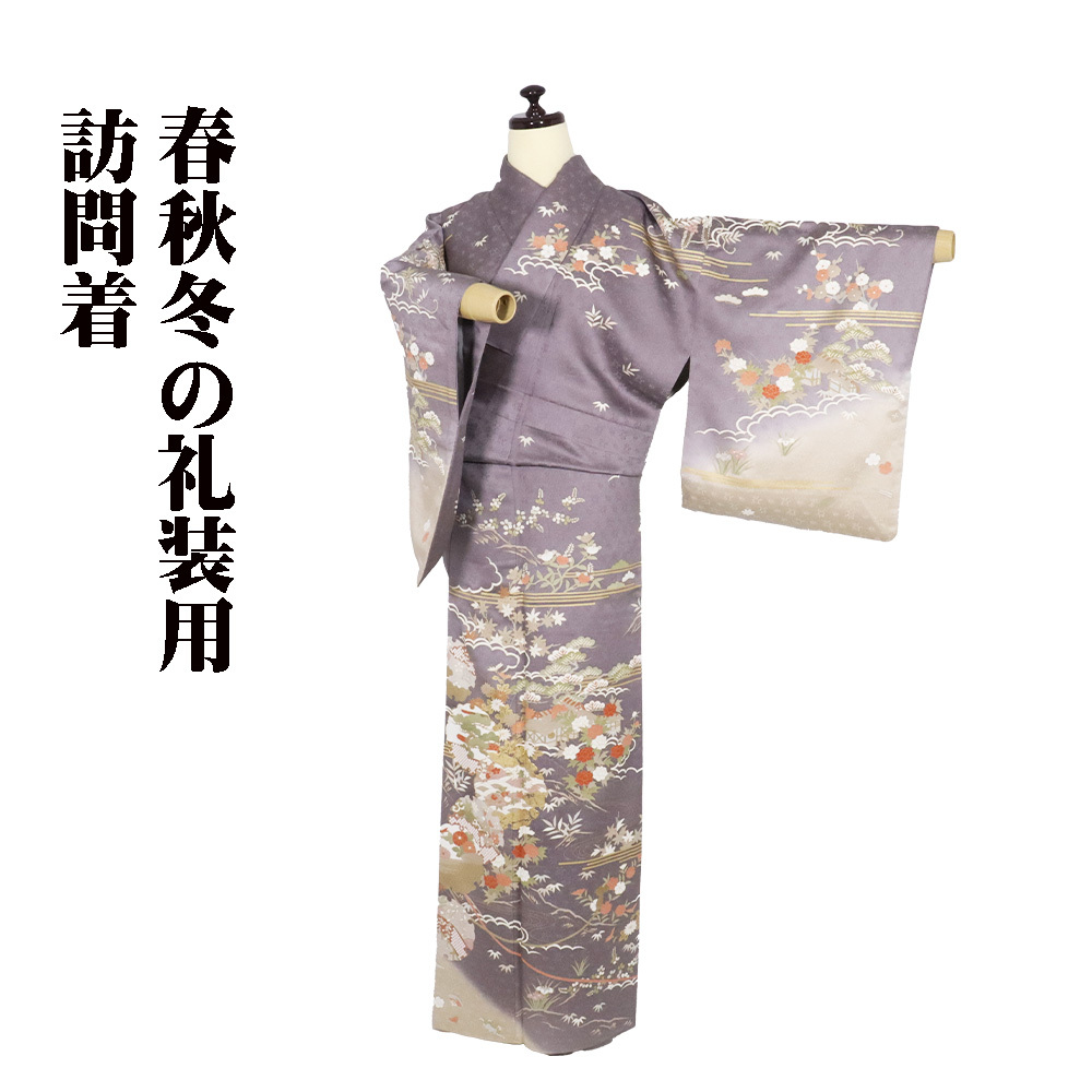 | 友禅訪問着 袷 丹後縮緬地 紫色(葡萄鼠色)・薄緑(薄萌葱色)・暈し 本紋綸子地 茶屋辻・四君子・雪輪文 松竹梅・蘭・紅葉・菊・菖蒲・桜・南天・牡丹・藤 161 広襟 | |