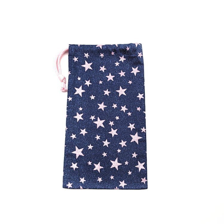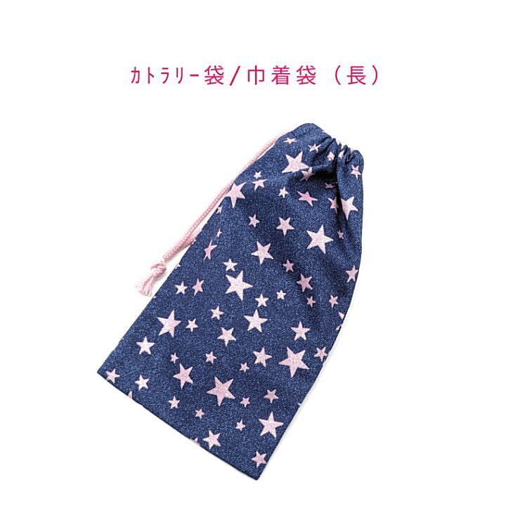 カトラリー袋・巾着袋 長方形【デニム調 ラメスター柄 ネイビー×ピンク】カトラリーケース 箸袋 はし袋 コップ袋 ポーチ 収納袋 星