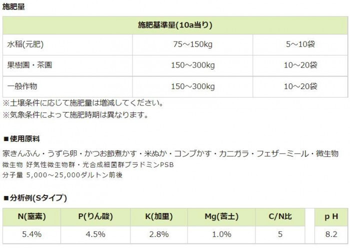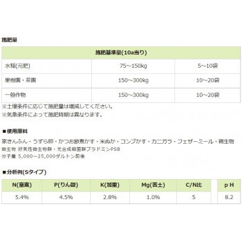 | ボカシ大王(R)エコは、高タンパクの飼料を与えられているうずらふんをベースに、うずら卵、かつお節煮かす、植物かす、コンブかす、カニガラ等を添加しスムーズな肥効を示すように発酵させた有機100%のボカシ肥料です。窒素成分を強化させるため、フェザーミールを追加しています。活性の高い光合成細菌を植菌し、ビタミン・ミネラルを強化しています。 【特徴と効果】 ●窒素・りん酸・加里をバランスよく含み、各種ミネラル等も含まれていますので、作物の栄養源として優れた肥効が得られます。 ●天然の緩効性肥料ですので、作物にじっくりと肥効を示します。 ●土壌の微生物にとって良質なエサとなり、土壌を豊かに育てます。 ●作業性を重視した粒状タイプとなっております。 ●水稲に使用する場合、春先の低温等により肥効が遅れ茎数不足になる場合がありますので、別売りの鰹ソリューブル8000等での追肥を一考ください。 |