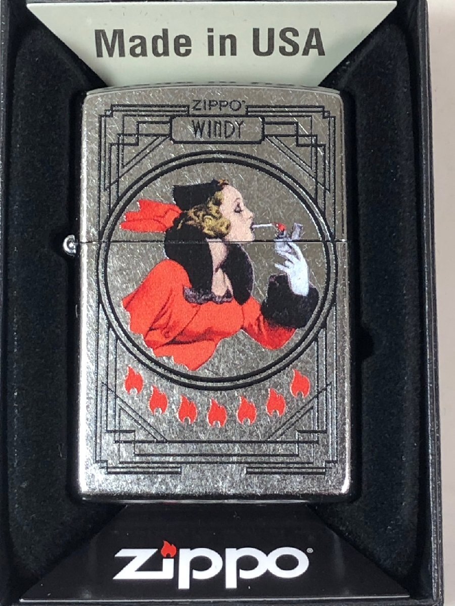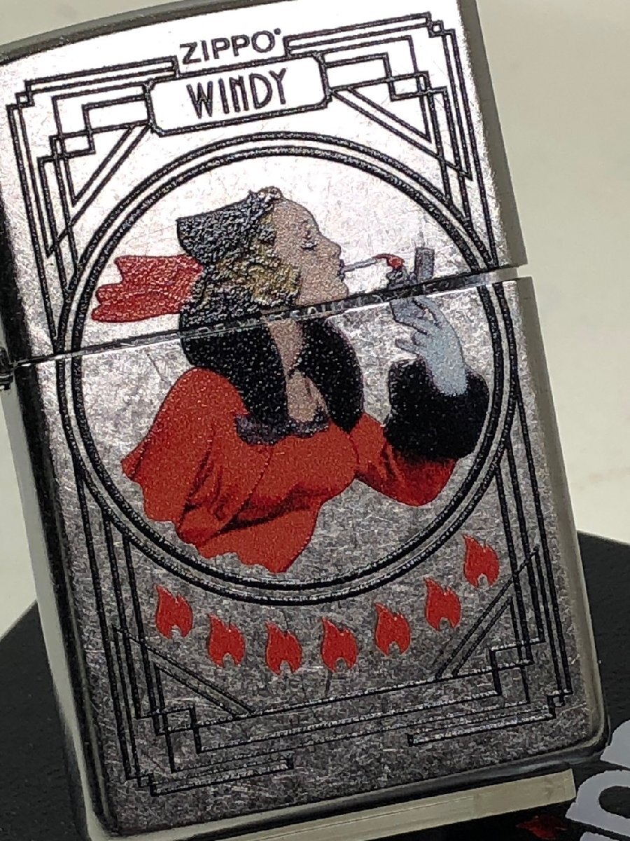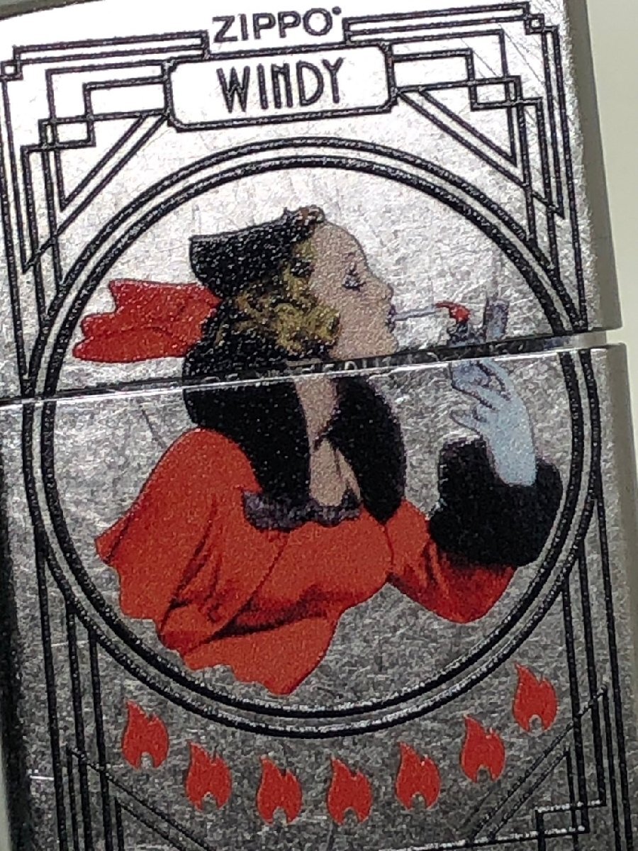 ★Zippo Windy ウィンディ・ガール、風に強いをイメージした「人気のZippoの広告塔(Windyガール)」、純正Zippo#207ベース(ストリートクローム)、ウィンディーBoxデザイン、アメリカZippo社純正加工。裏面はクローム銀色の無地。