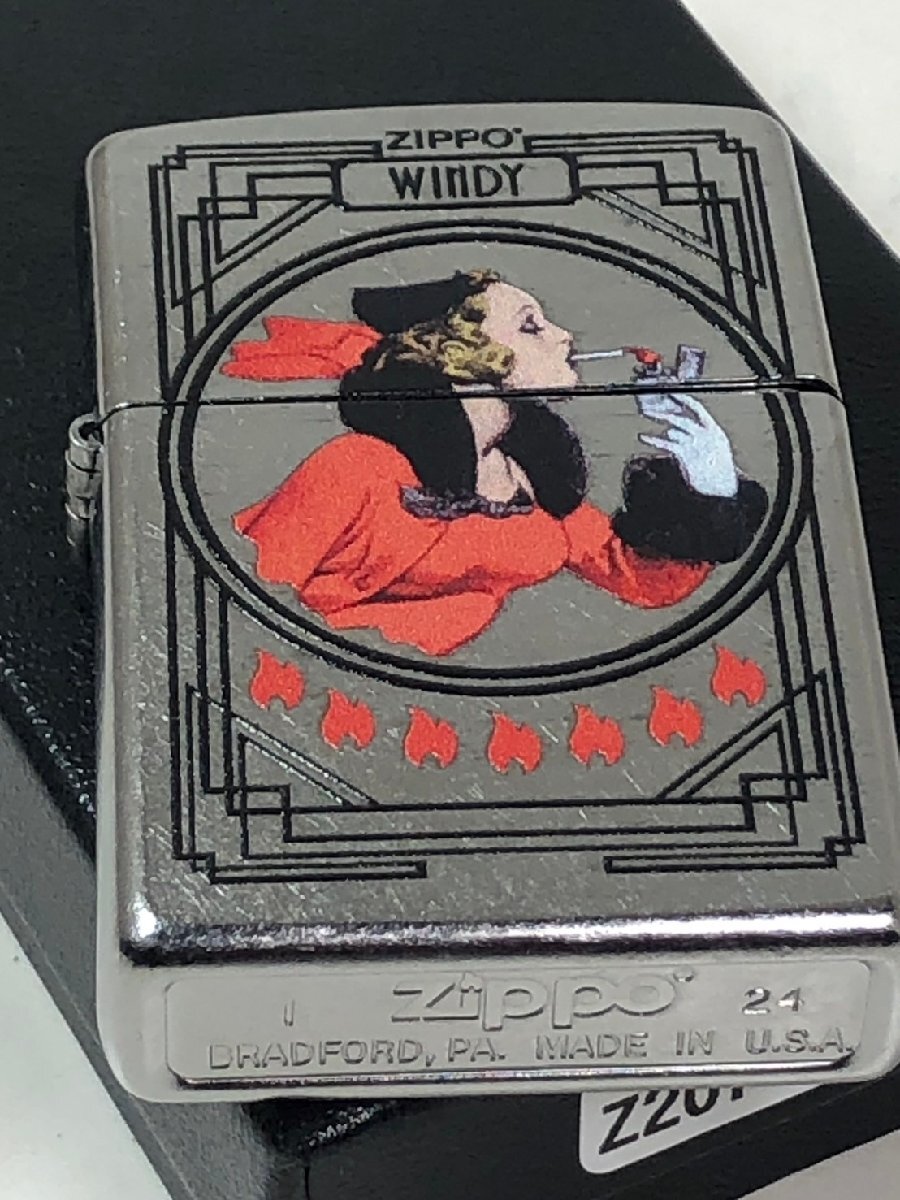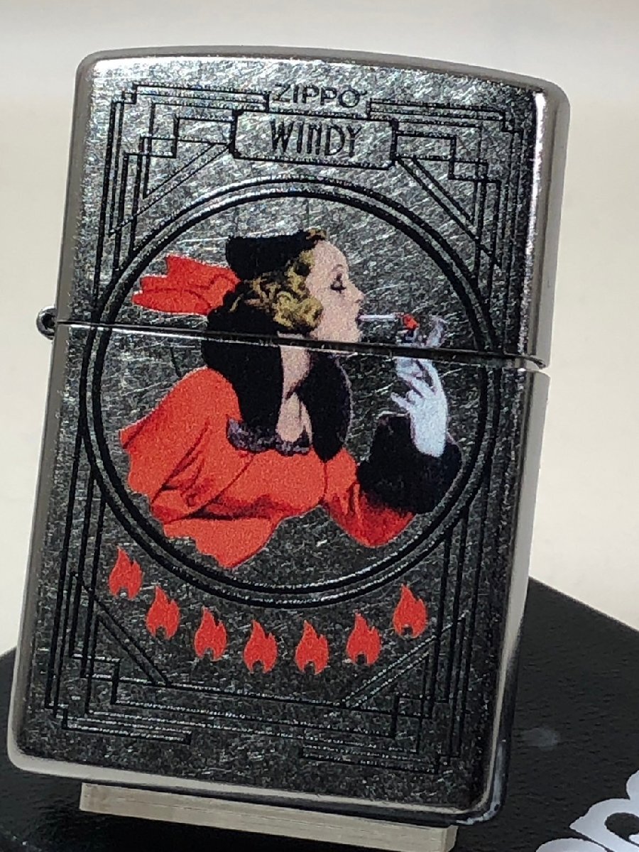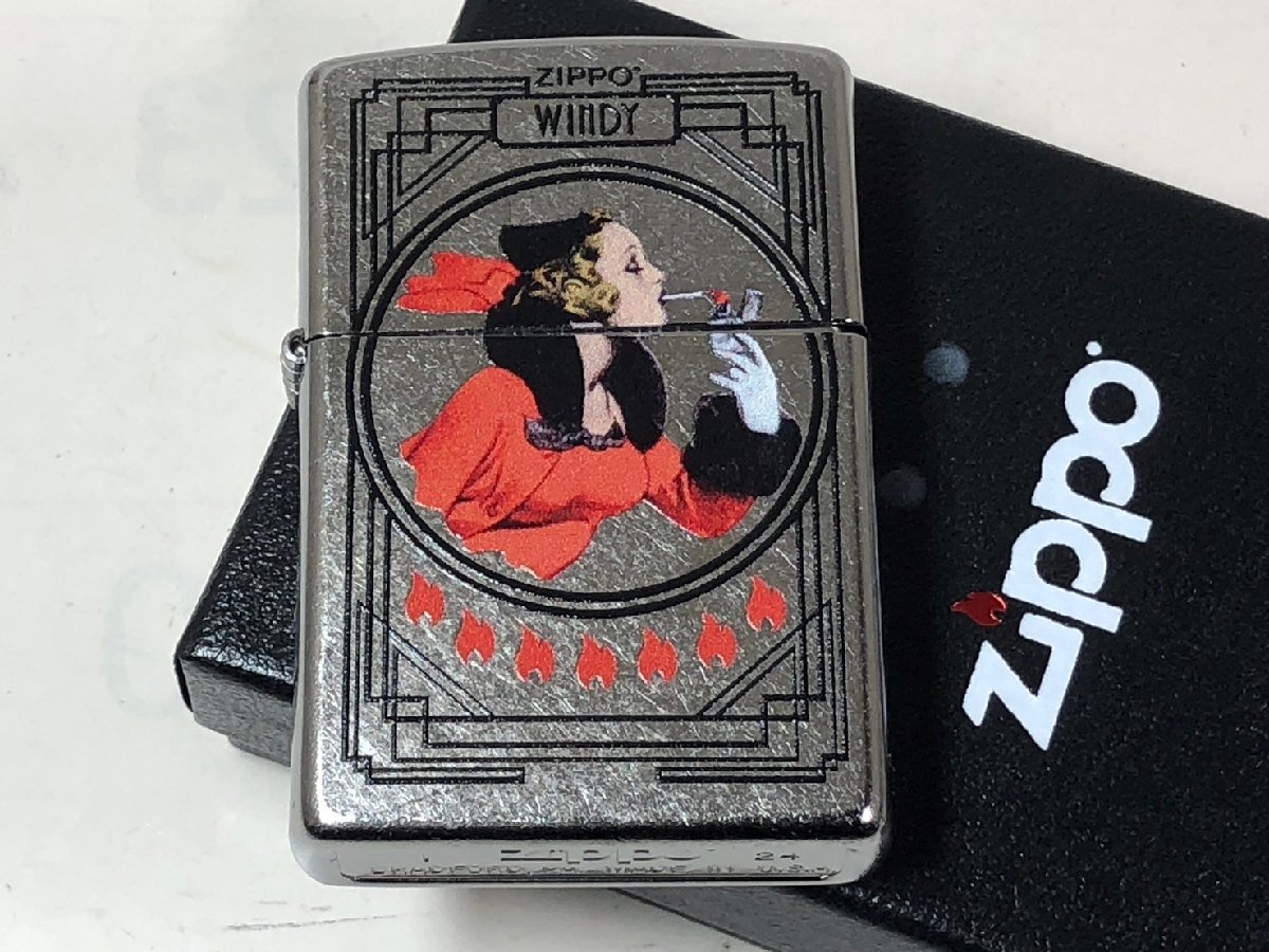 ★Zippo Windy ウィンディ・ガール、風に強いをイメージした「人気のZippoの広告塔(Windyガール)」、純正Zippo#207ベース(ストリートクローム)、ウィンディーBoxデザイン、アメリカZippo社純正加工。裏面はクローム銀色の無地。