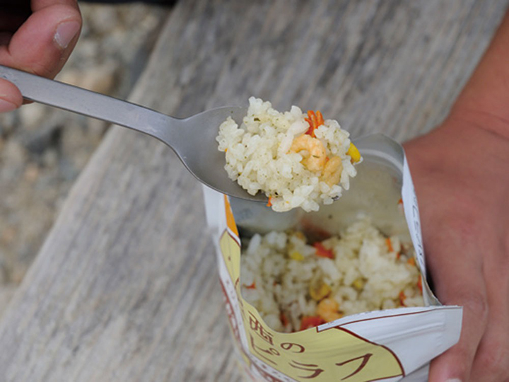 山の定番、袋飯にも十分対応します。スリムなフォルムですが、有効面積は広いので、ライス等をしっかりとすくえます。