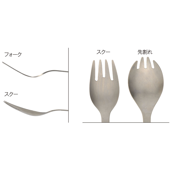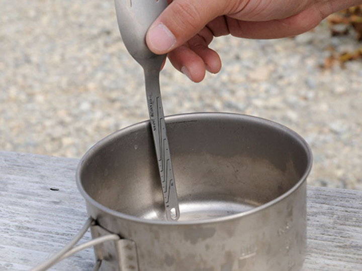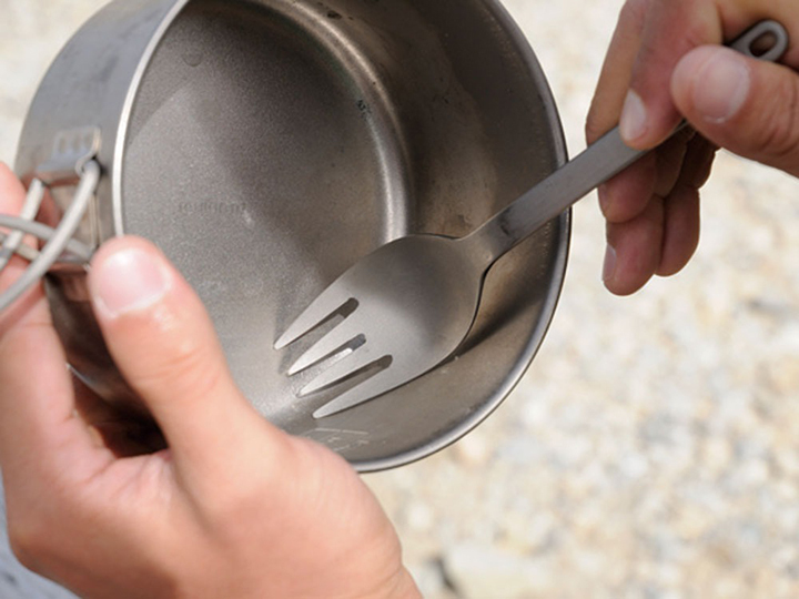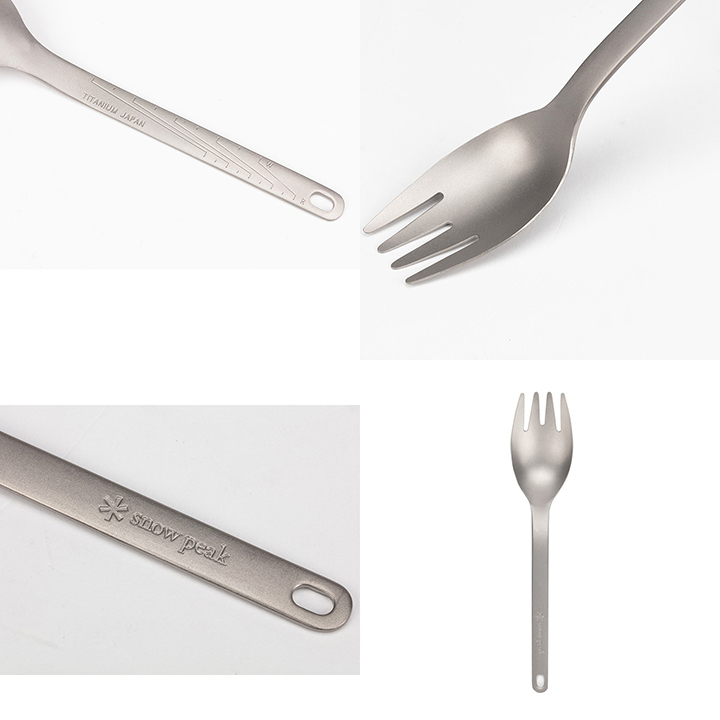 スプーンとフォークを兼ねているスクー。これを1本持っていれば、ご飯や麺、スープなど、どんな料理も美味しく食べられます。持ち手にはアウトドアでご飯を炊くときに便利な飯炊きスケールが付いています。アウトドア好きに持っていてもらいたいカトラリーです。軽くて丈夫なチタンを使ったバックパッカー向けカトラリー。