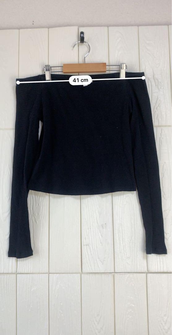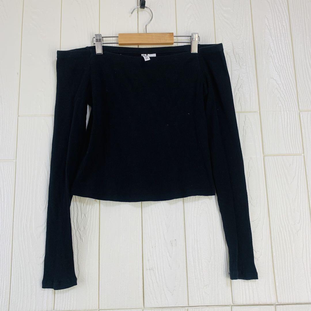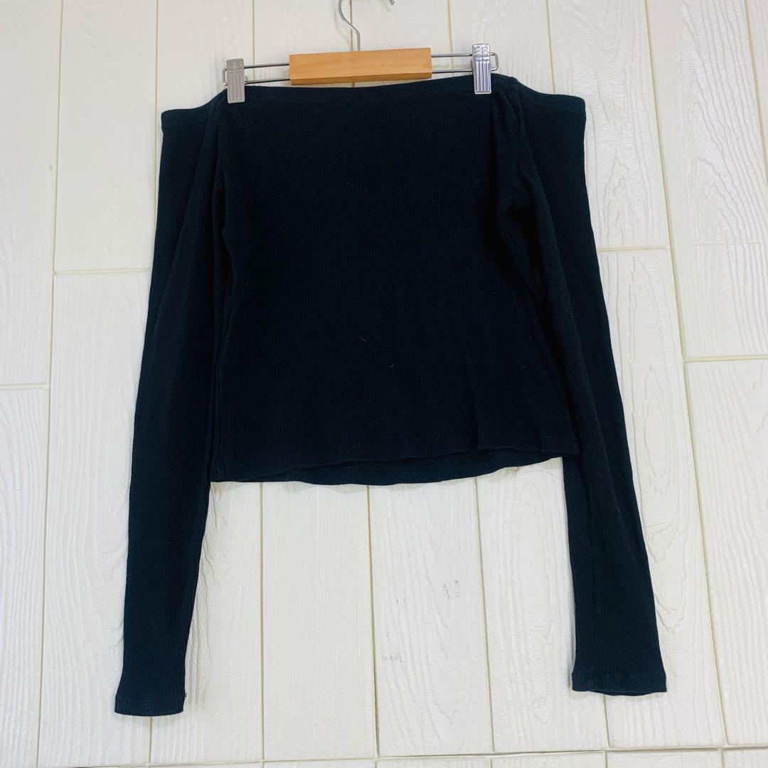 オフショルダーの黒い長袖トップス、スタイリッシュなデザイン。