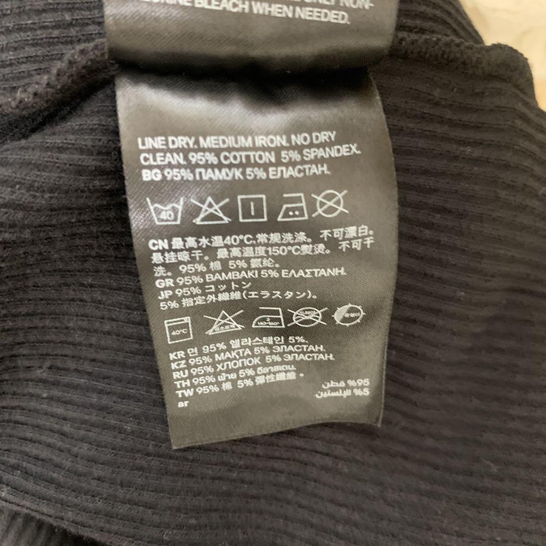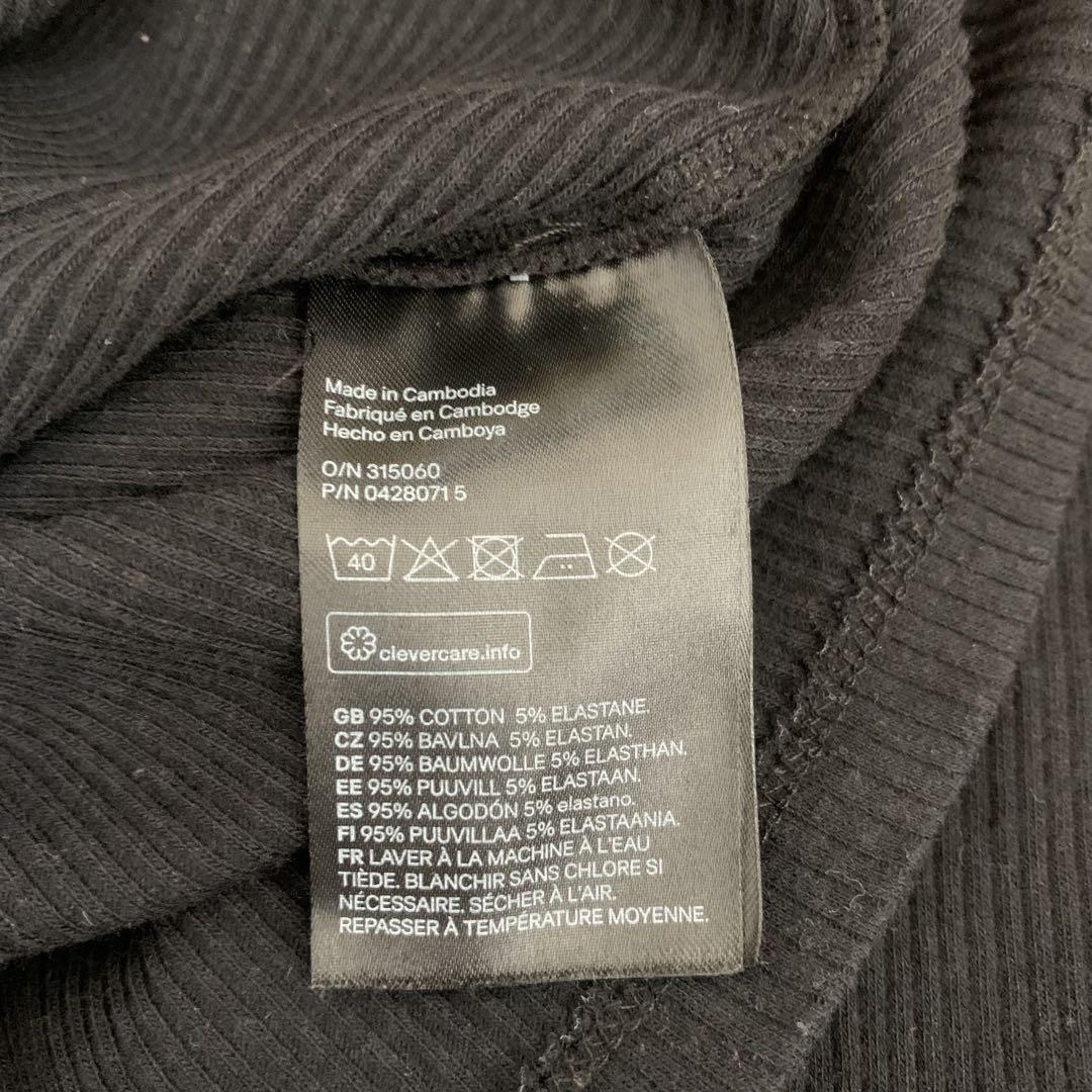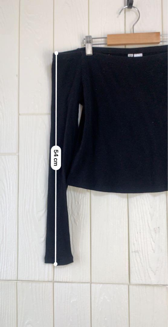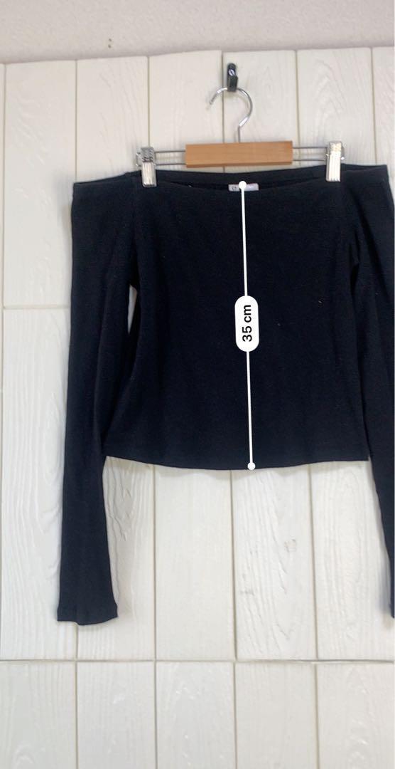 オフショルダーの黒い長袖トップス、スタイリッシュなデザイン。