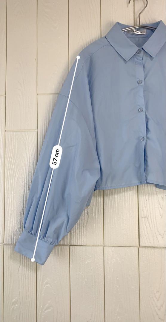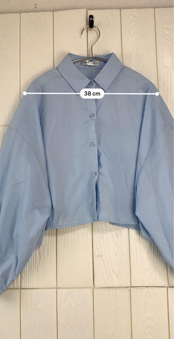 ライトブルーのクロップドシャツ、38cmの肩幅と37cmの着丈で、スタイリッシュなデザインが特徴。