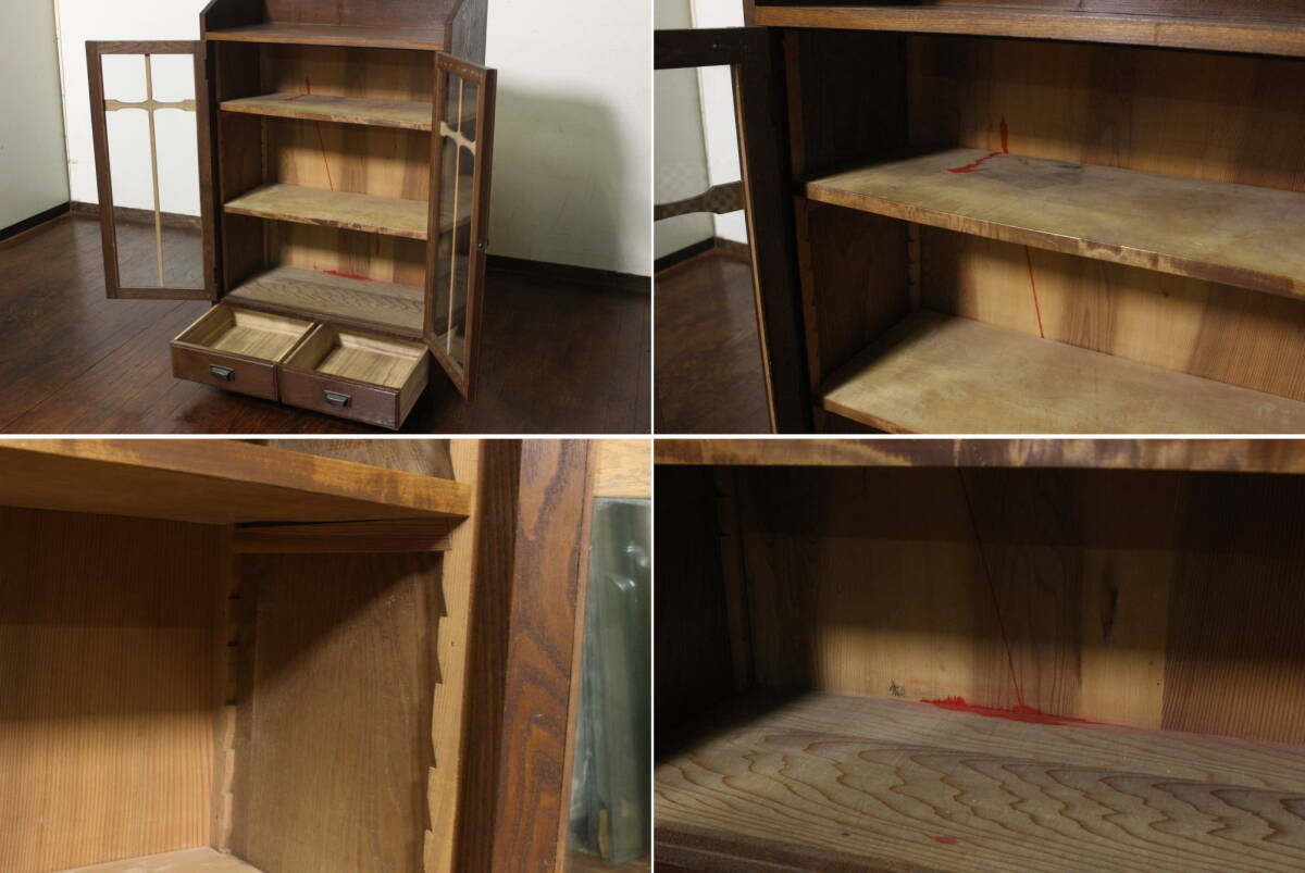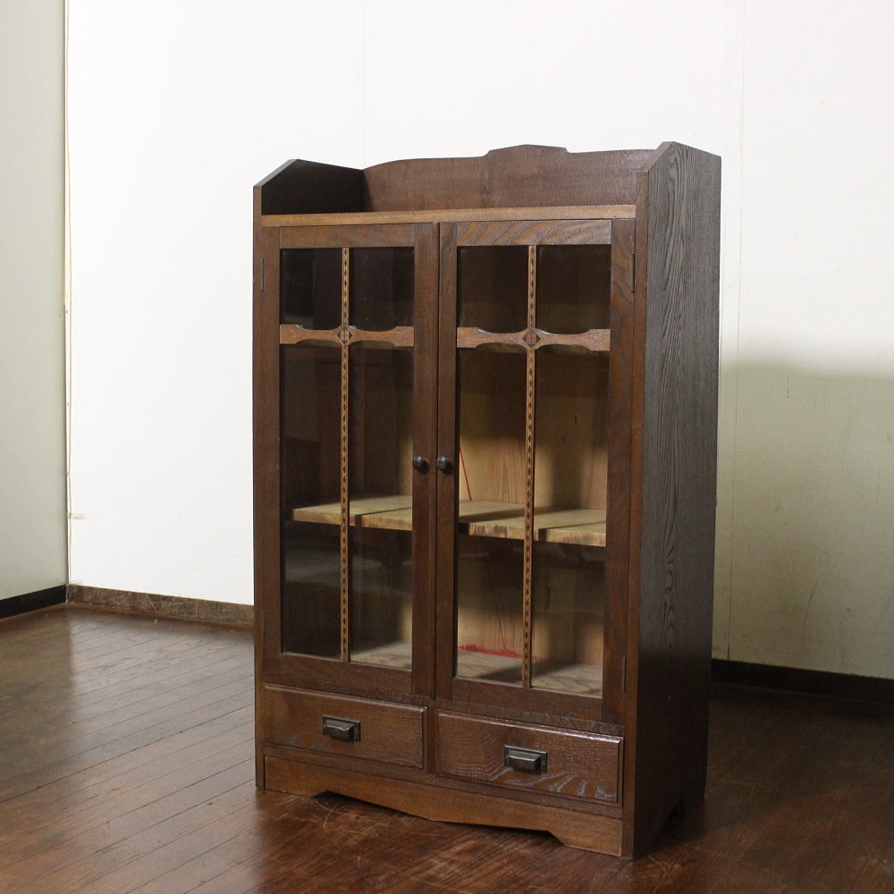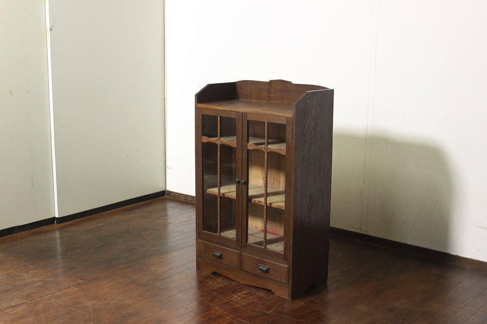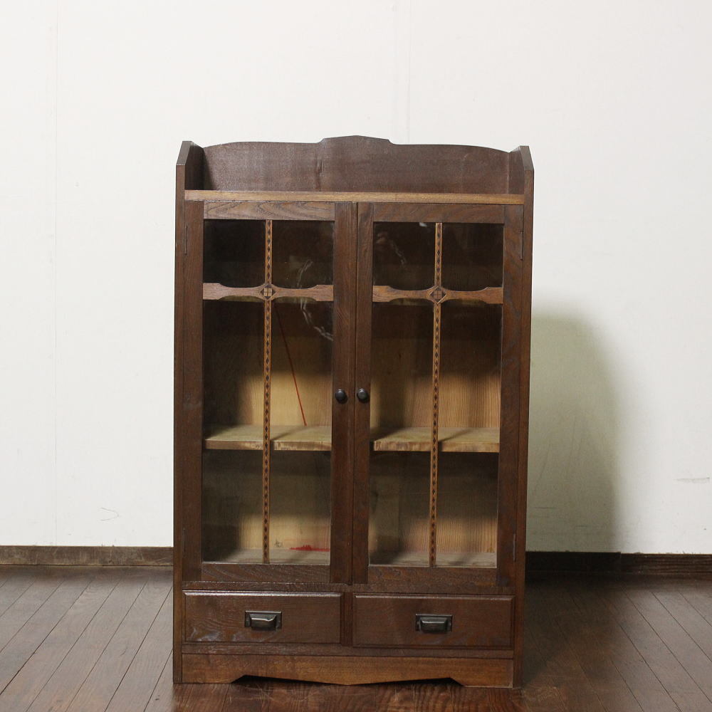 おそらく昭和初期頃からのものではないでしょうか。 ガラスは当時の古い揺らぎのある古いガラス。 扉の飾りや象嵌細工もとても素敵です。 棚板は高さ調節可能です。 板に反りがありカタツキがあります。 下部には2杯の引出し付き、ちょっとした収納に重宝です。 古い風合いを楽しみながらの使用はもちろん、 お好みにカスタマイズしての使用も良いのではないでしょうか。 お好きな陶器やガラス等のコレクションを飾るのもよし、 店舗用ディスプレイとしても活躍間違いナシかと思われます。 |