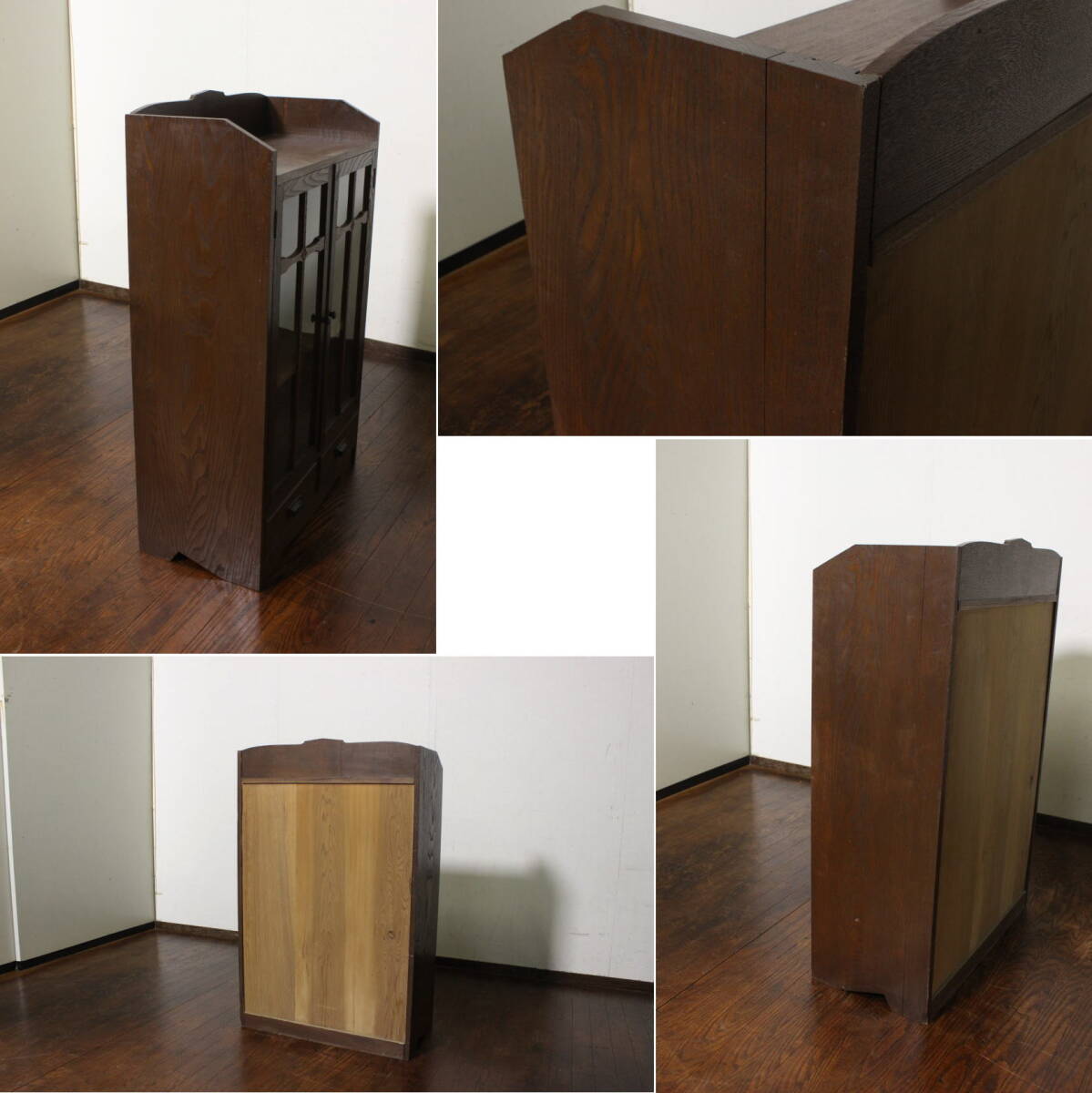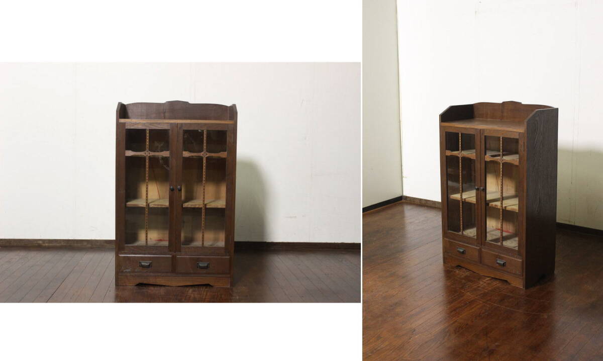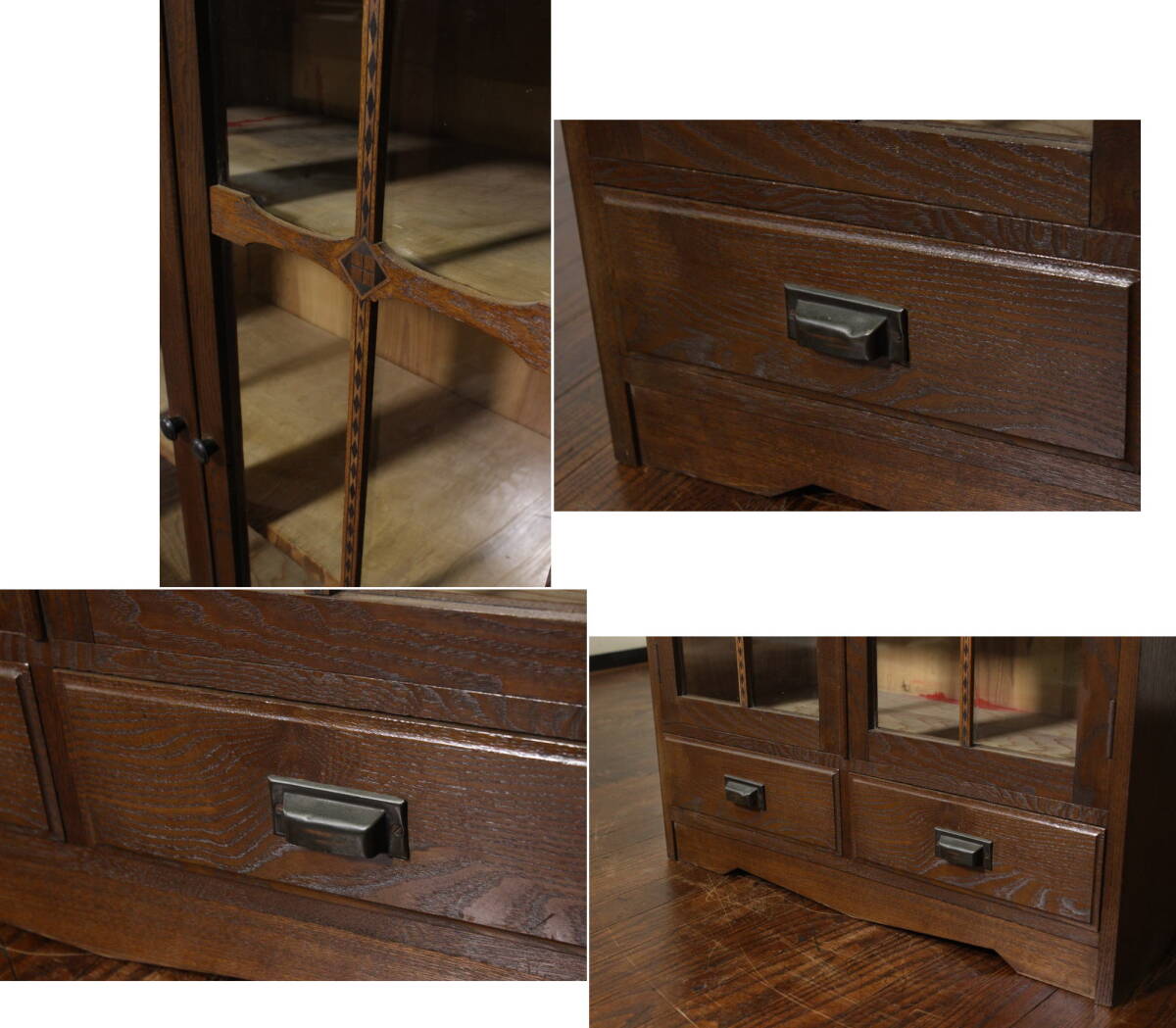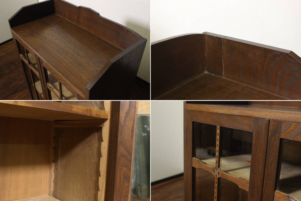 おそらく昭和初期頃からのものではないでしょうか。 ガラスは当時の古い揺らぎのある古いガラス。 扉の飾りや象嵌細工もとても素敵です。 棚板は高さ調節可能です。 板に反りがありカタツキがあります。 下部には2杯の引出し付き、ちょっとした収納に重宝です。 古い風合いを楽しみながらの使用はもちろん、 お好みにカスタマイズしての使用も良いのではないでしょうか。 お好きな陶器やガラス等のコレクションを飾るのもよし、 店舗用ディスプレイとしても活躍間違いナシかと思われます。 |