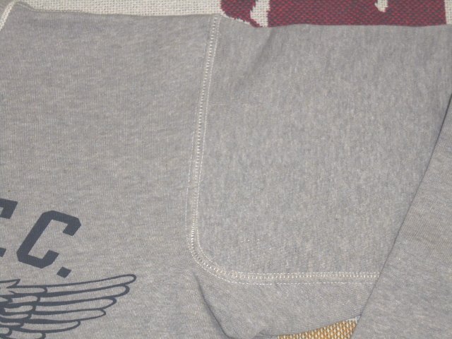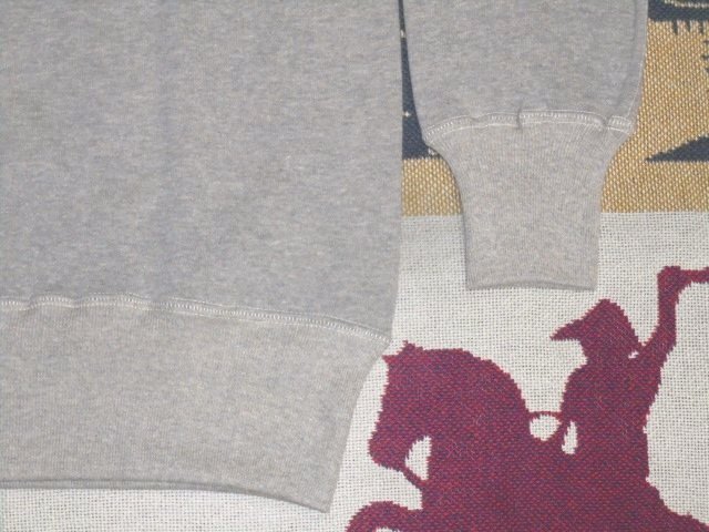 (3)アメリカのインチサイズによる二本針仕様 広いピッチの運針や内側の比較的粗めのロック糸が表から見える仕様はヴィンテージスウェットにしかみられないディテール。