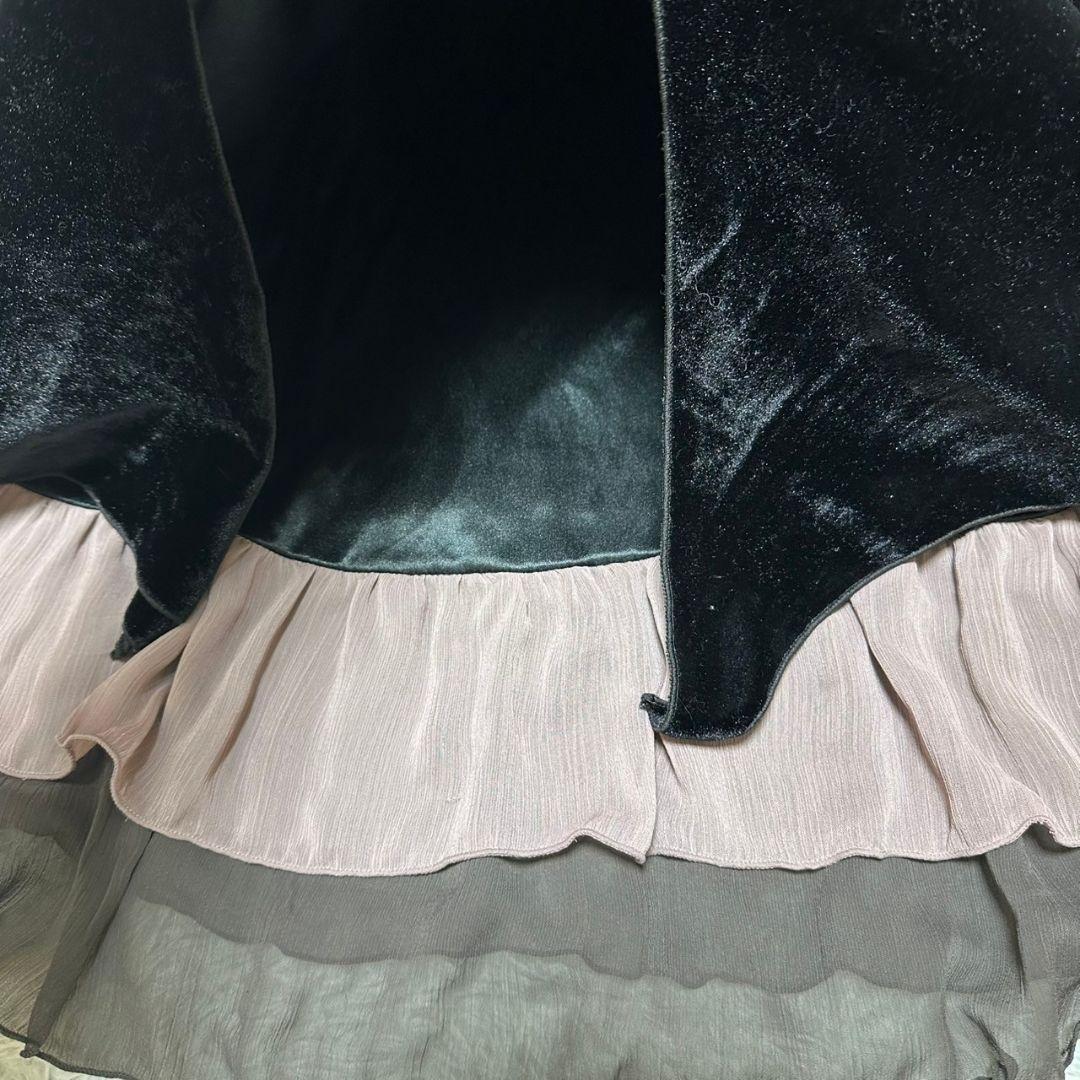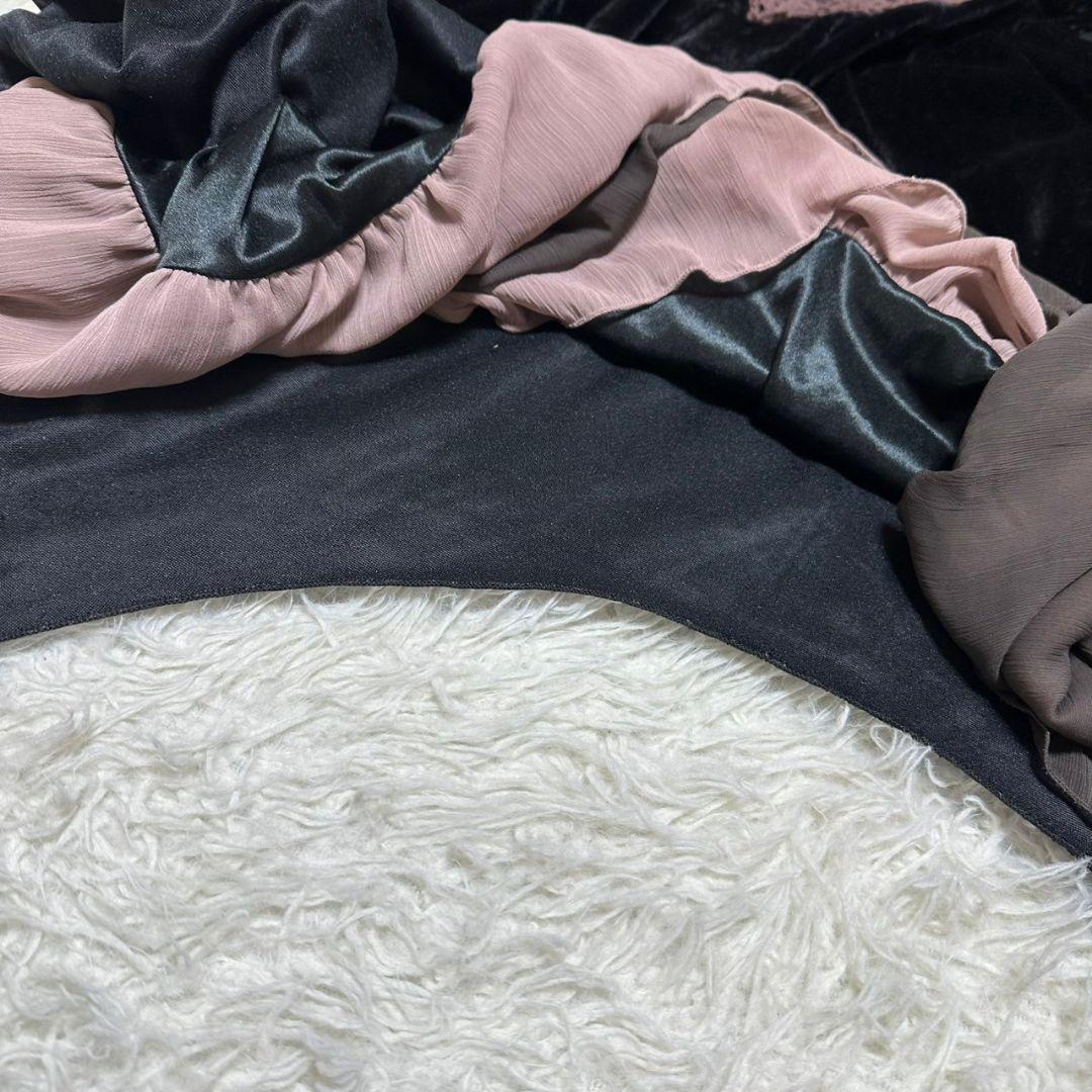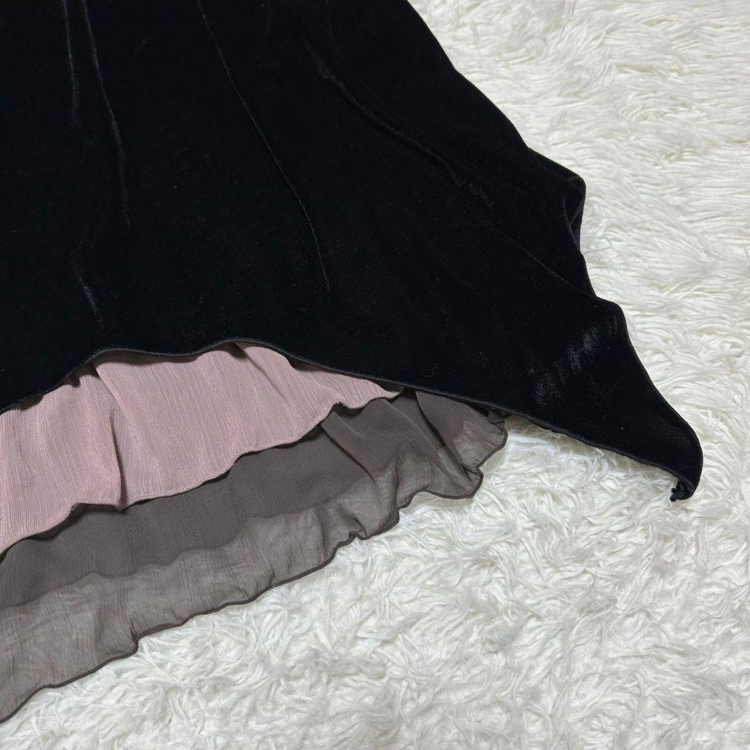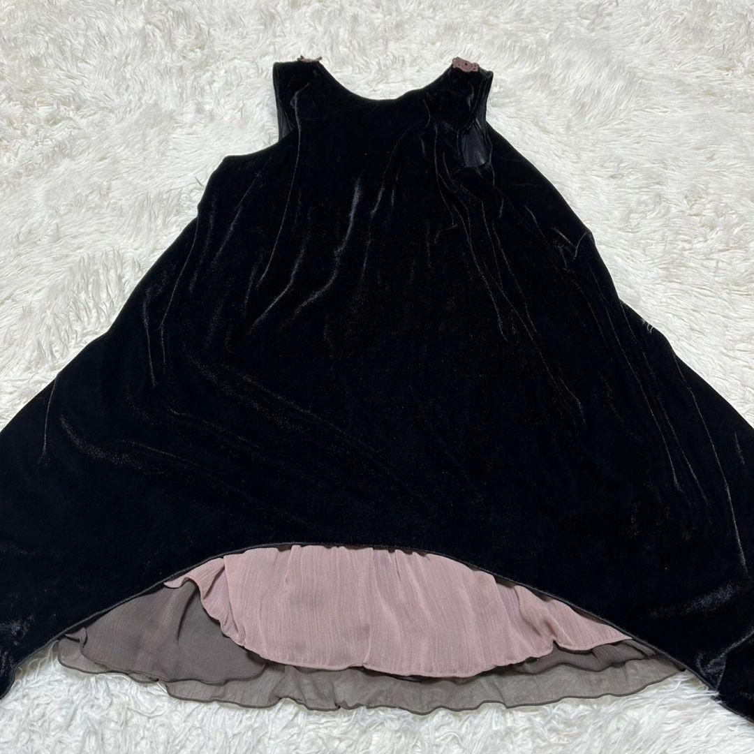 ベルベット素材のアシンメトリックノースリーブチュニック、レースのネックラインが特徴。