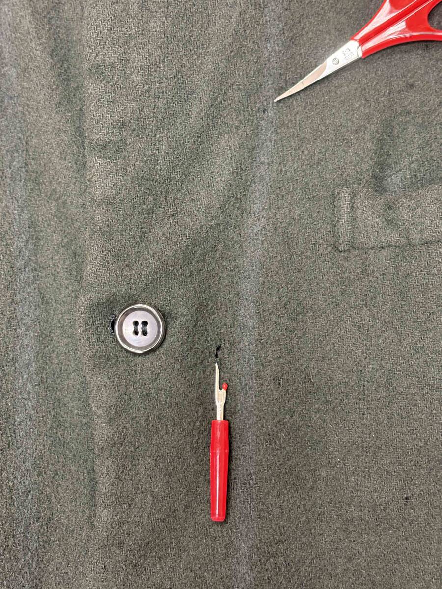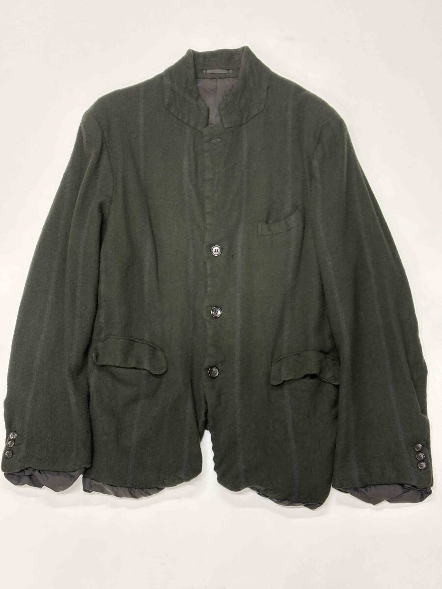 COMME des GARCONS HOMME PLUS コムデギャルソンオムプリュス 94AW 縮絨セットアップになります。色は濃いアーミーグリーンに濃いグレーのストライプ。サイズは上下共にMサイズ。ジャケットは第一ボタン左に5ミリ位の虫喰い穴が2つ、左脇下に5ミリ位の虫喰い穴が2つ。