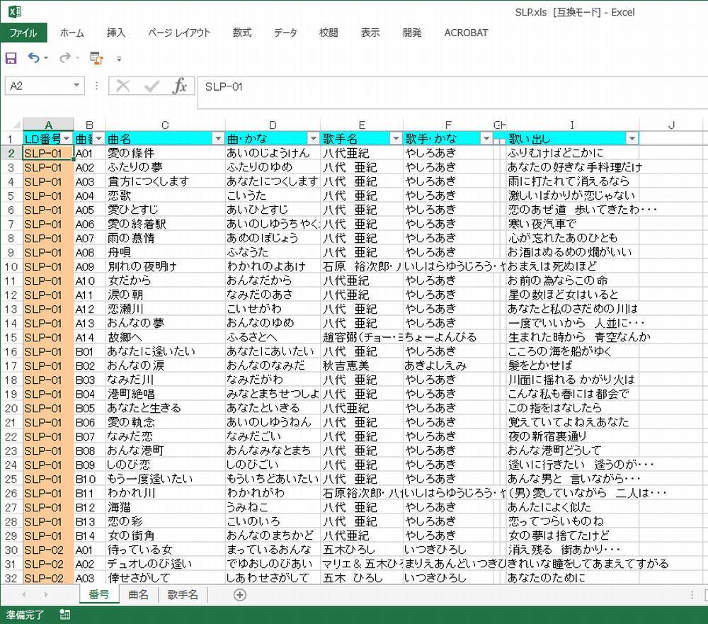 第一興商のレーザーカラオケ(LD-SLP)の曲名・歌手名等をエクセル形式のファイルに整理したものです。