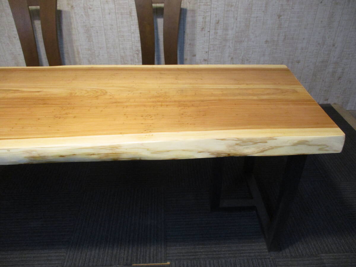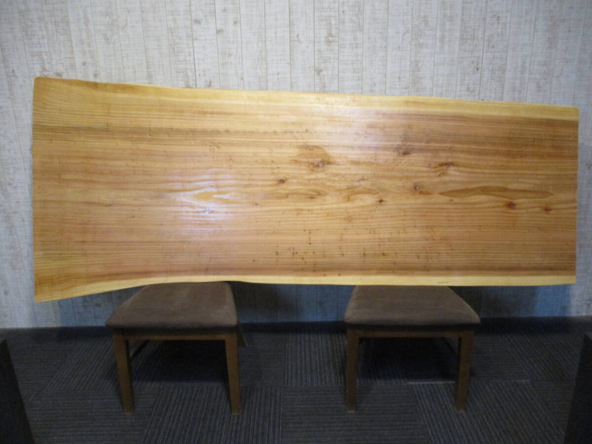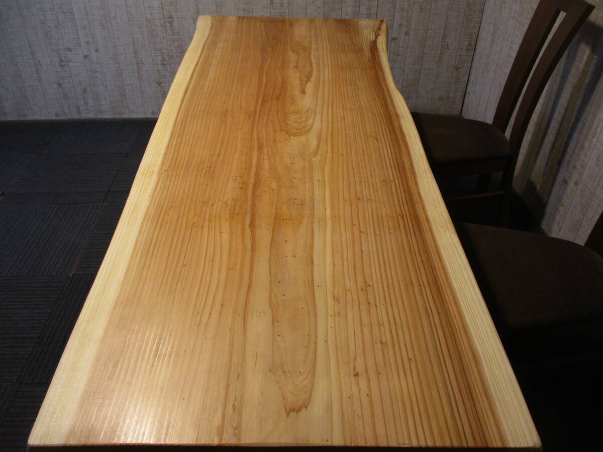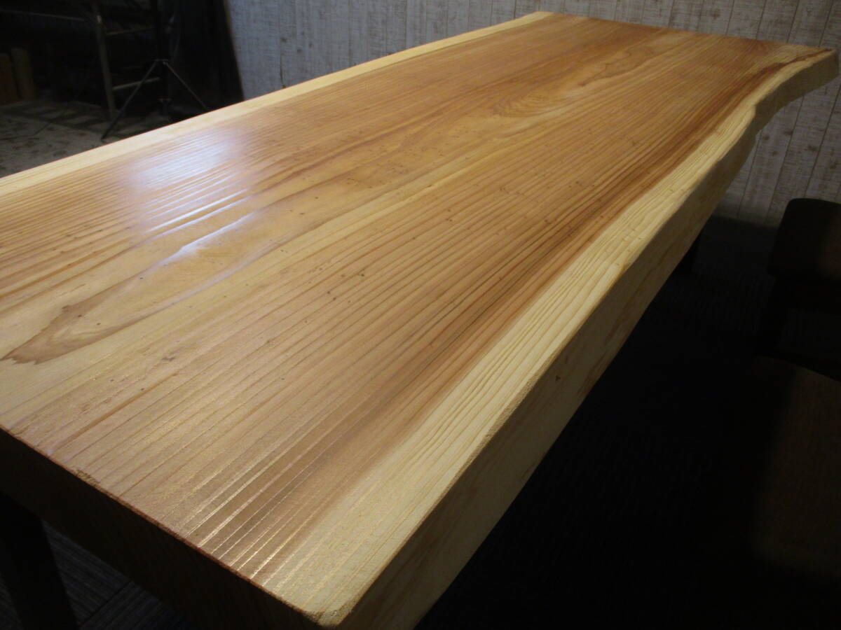杉の一枚板無垢のテーブルです。ブランド、メアサ杉です。目立つ大きな節や節穴もなく、杢目の柄も素敵です。両面使用できます。ずっしりして高級感があります。