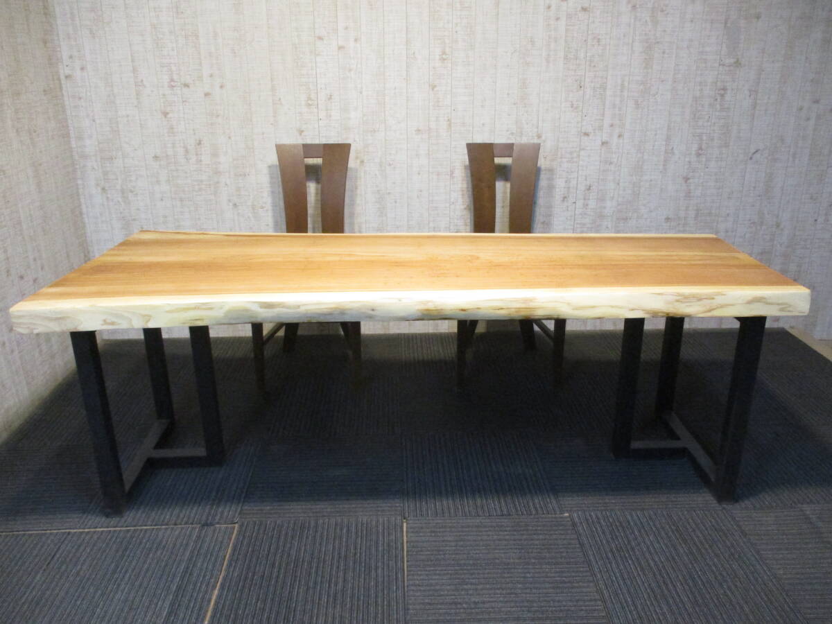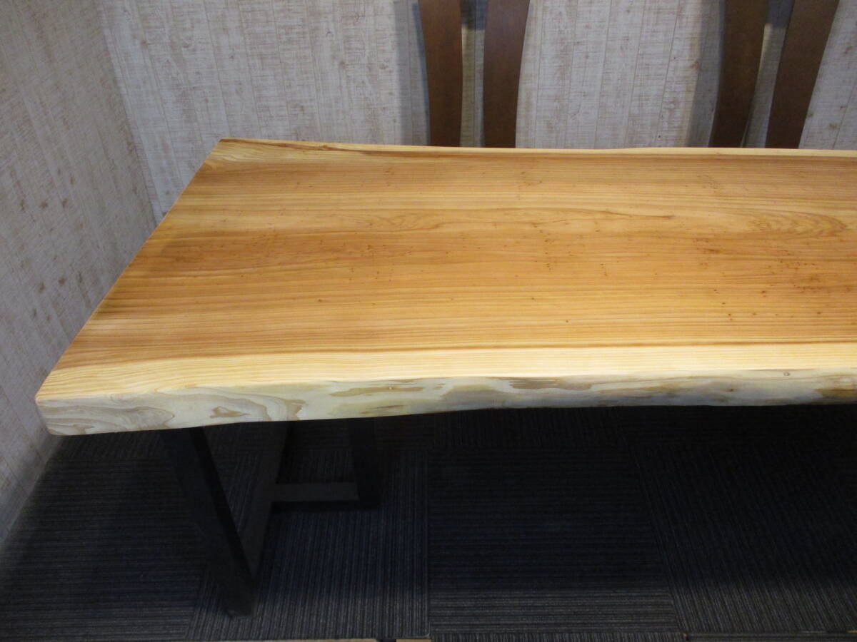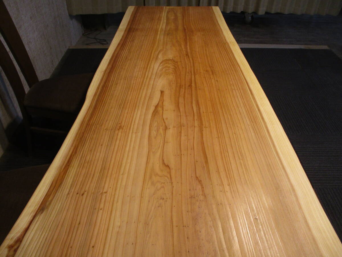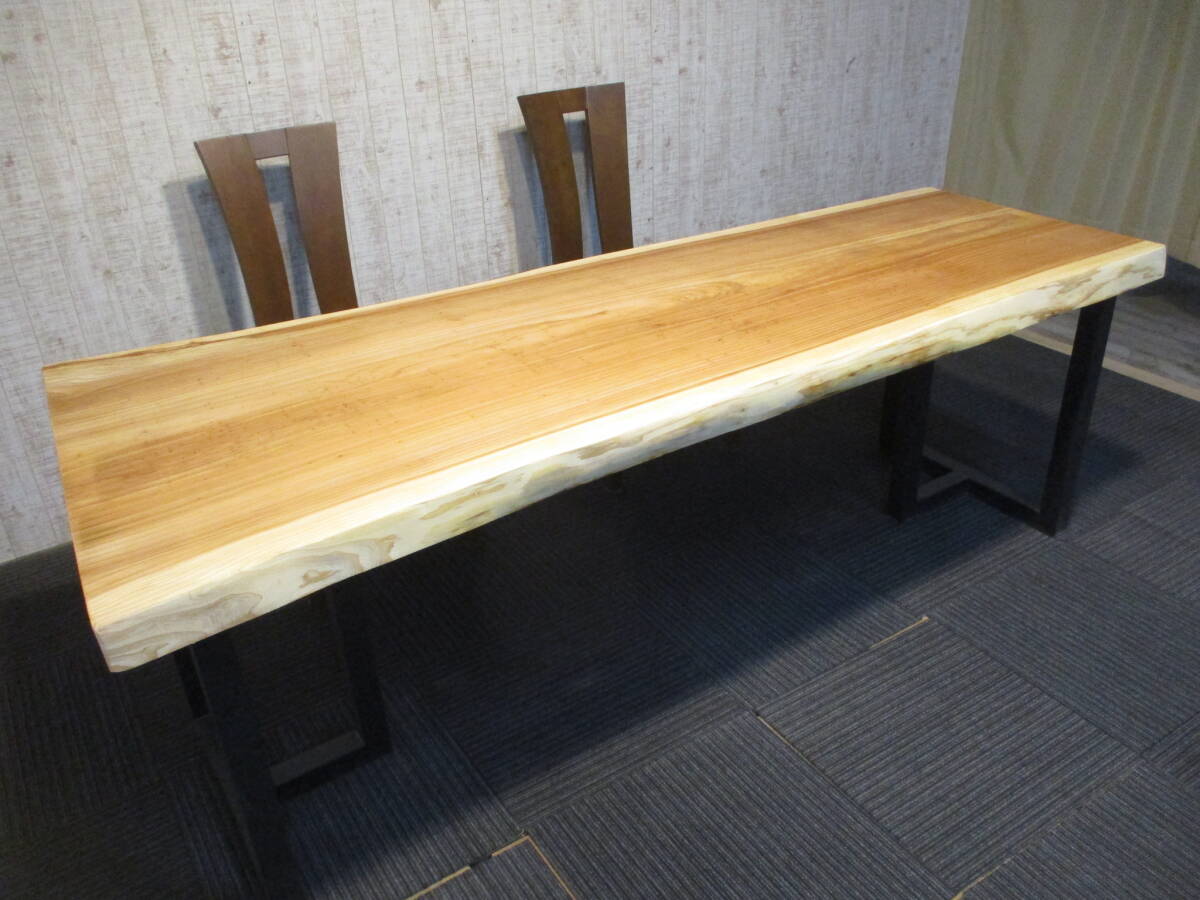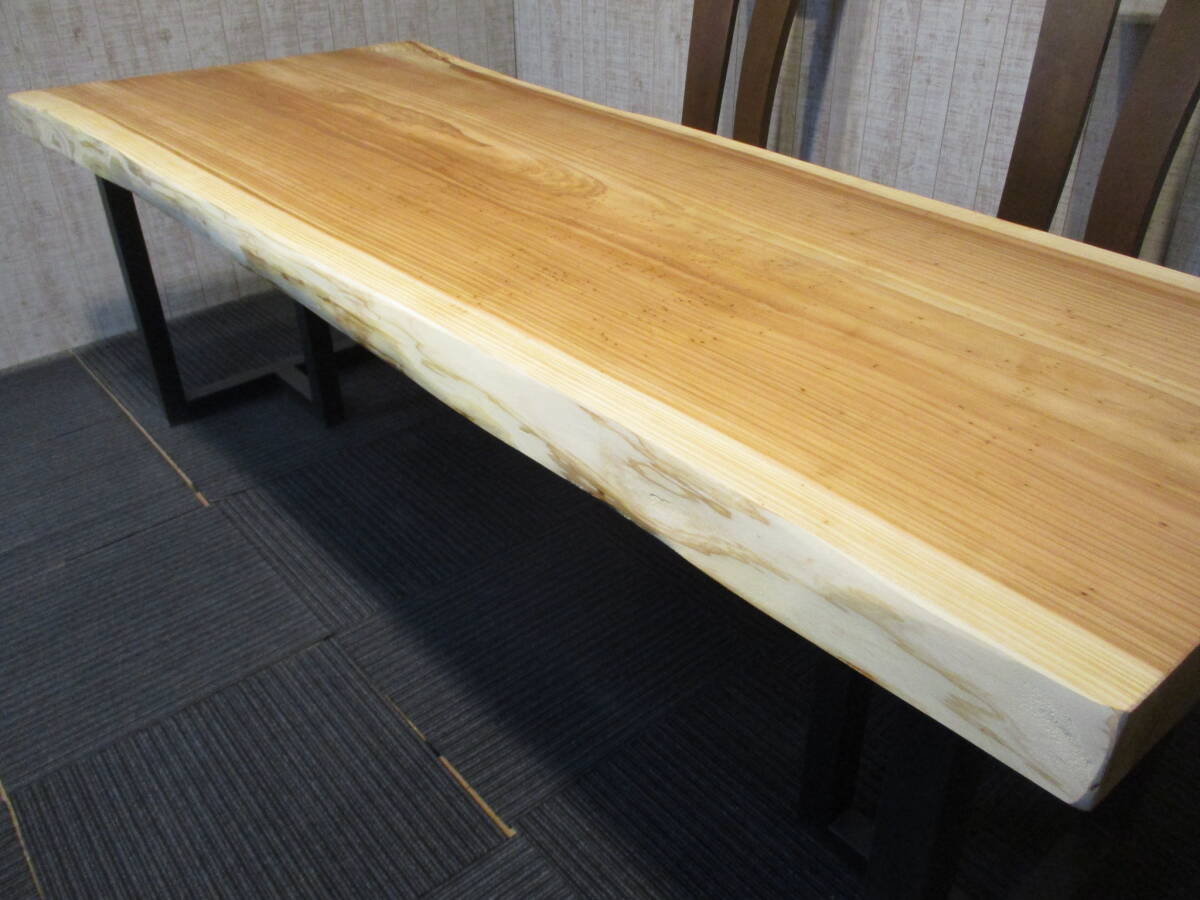 杉の一枚板無垢のテーブルです。ブランド、メアサ杉です。目立つ大きな節や節穴もなく、杢目の柄も素敵です。両面使用できます。ずっしりして高級感があります。