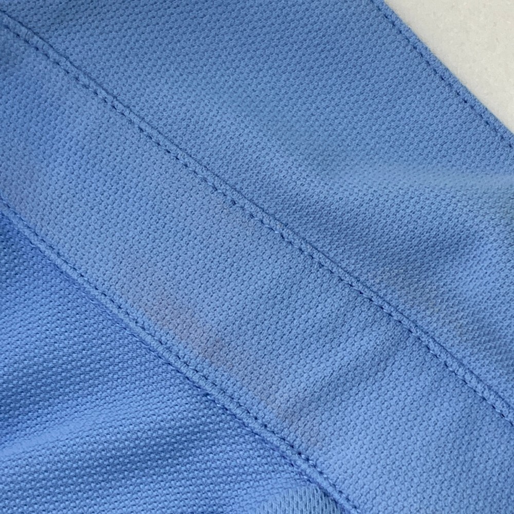 B ネック・ボタン裏に汚れ、フロントに糸つれ |
