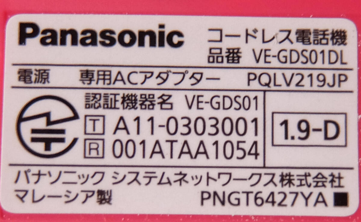 Panasonicパナソニック VE-GDS01DL 充電台付親機 VE-GD501-P コードレス子機1台ピンク 管理番号17中古品です。