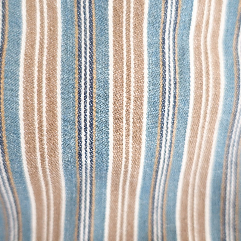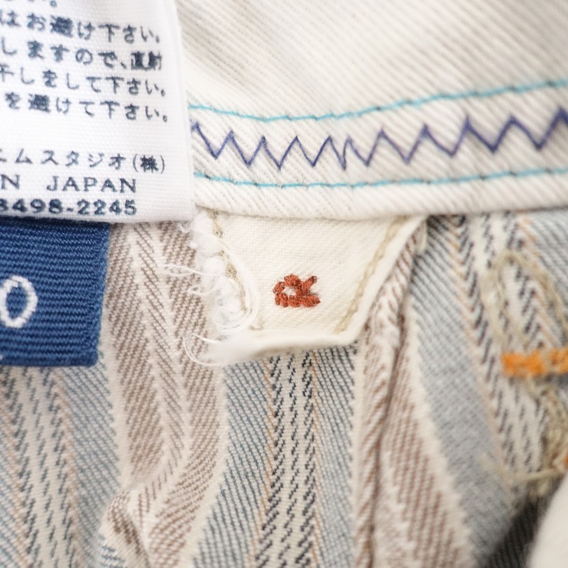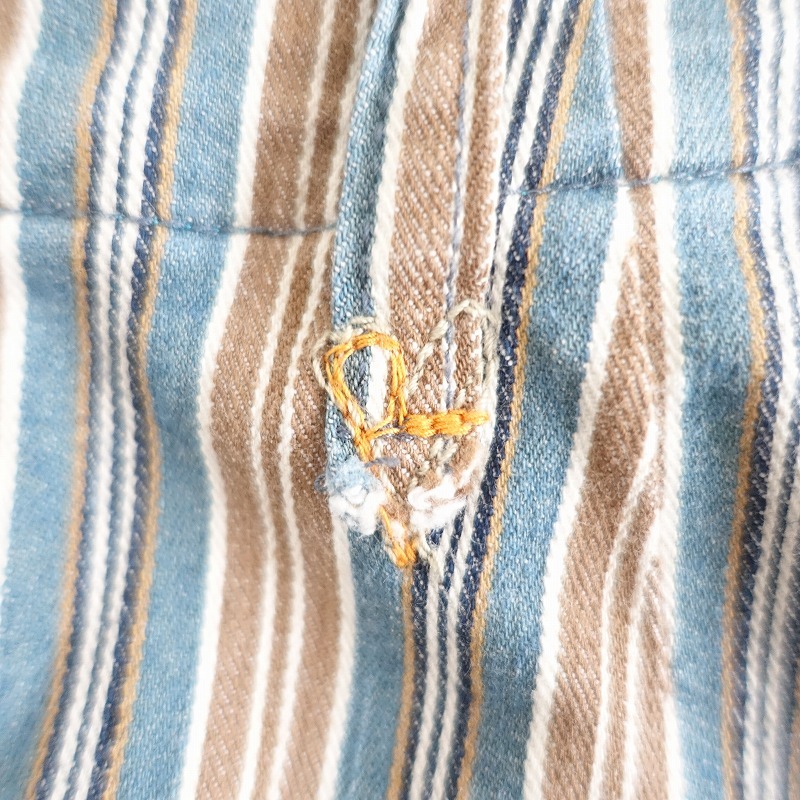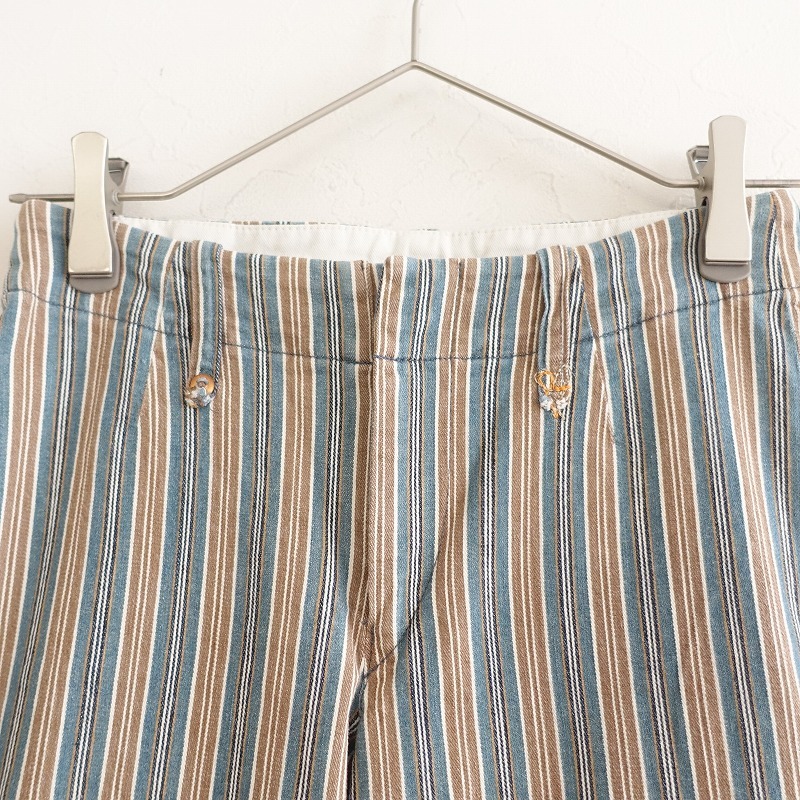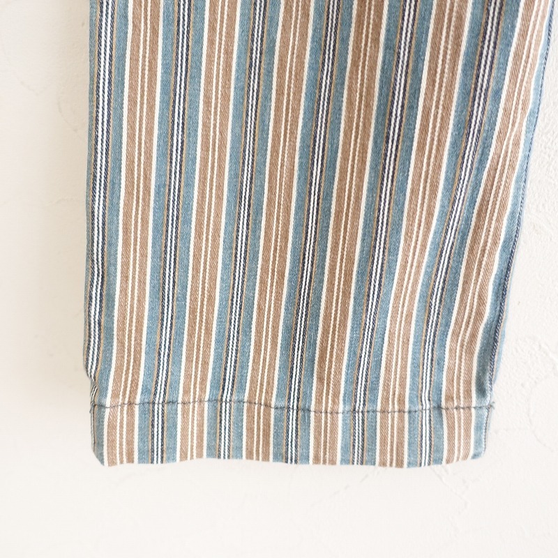 | R45RPMのマルチストライプストレッチクロップドパンツです。カラーはライトブラウン・オフホワイト・ライトブルー・ネイビーで、マルチストライプ織のストレッチ入りの生地で仕立てられております。半端丈のシルエットになっており、フロント開口部は内ボタン・フック&ファスナー仕様で、フロント左腰に「R」のブランドロゴ刺繍があしらわれております。 |