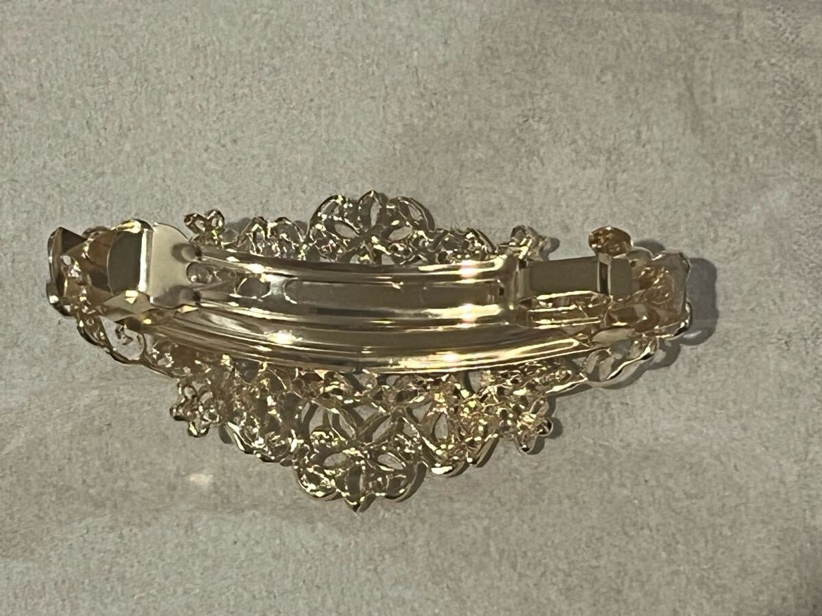 ゴールドでフラワーの模様です。花の中心にはラインストーンが施されており、光が当たると全体的にキラキラと光ります。詳しくは写真を参考にお願いします。