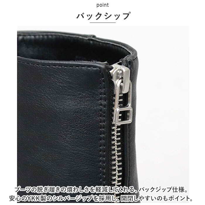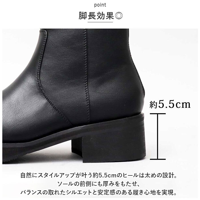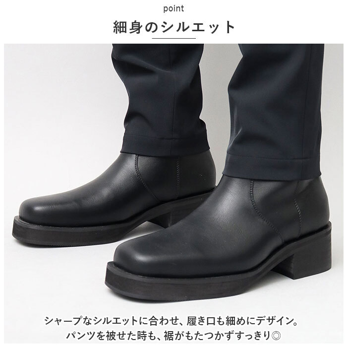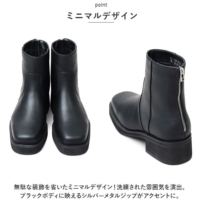 商品説明 | ・・シャープなスクエアトゥとボリューム感のある厚底ソールがモード感漂う「glabella(グラベラ) SQUARE TOE BOOTS」が新登場。 ・【ミニマルデザイン】 ・無駄な装飾を省いたミニマルデザイン!洗練された雰囲気を演出。ブラックボディに映えるシルバーメタルジップがアクセントに。 ・【脚長効果◎】 ・自然にスタイルアップが叶う約5.5cmのヒールは太めの設計。ソールの前側にも厚みをもたせ、バランスの取れたシルエットと安定感のある履き心地を実現。 ・【細身のシルエット】 ・シャープなシルエットに合わせ、履き口も細めにデザイン。パンツを被せた時も、裾がもたつかずすっきり◎ ・【バックシップ】 ・ブーツの脱ぎ履きの煩わしさを軽減してくれる、バックジップ仕様。安心のYKK製のシルバージップを採用し、開閉しやすいのもポイント。 ・【軽量素材】 ・合成ソールで厚みを増すことで、重すぎず歩きやすさもばっちり。 ・【PUレザー】 ・滑らかなPUレザーを採用。柔らかく、足馴染みの良さもポイント。 ・クリーム等でのお手入れが不要なイージーケアも魅力。 ・【ムレにくく快適】 ・ライニングやインソールはメッシュ素材で、ムレにくく快適! ・【クッション性あり】 ・インソールのかかと部分に、程よくクッション性のある素材を使用。足裏をソフトに包み込んでくれて、足の疲れを軽減! ・【上品なスタイルに】 ・足元に上品なムードを添えてくれるスタイリッシュなブーツ。 |
