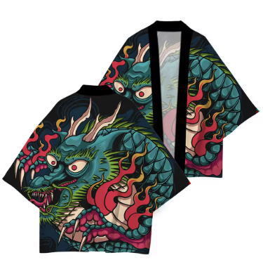 女性のための伝統的なプリント着物,日焼け止め,快適なカーディガン,柔らかい生地,ビーチや休暇用 色: 赤青 龍 サイズ:L