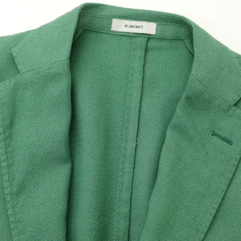 立体感のある織ながらウールシルクを用いる事で滑らかなタッチを表現したテーラードジャケットK.JACKETです。肩パッドや芯地を省いたアンコン仕立てになりまして、シャツジャケットのような軽快な着心地に仕上がっています。華やかな明るめのグリーンカラーが、春夏コーデのポイントとして活躍する一着です。